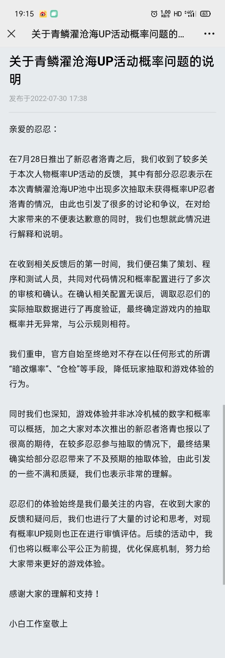 你自己内部检查自己有啥用呀,你自己检查自己那肯定是想咋说咋说。你要是想解决,那你就找其他有权威的部门,验证你28号更新的忍者池子,概率算法到底有没有杀熟。还有就是,我觉得他们是不可能承认概率有问题的,承认了就会有人蹲监狱,他们就算是游戏没了,也不会承认的。