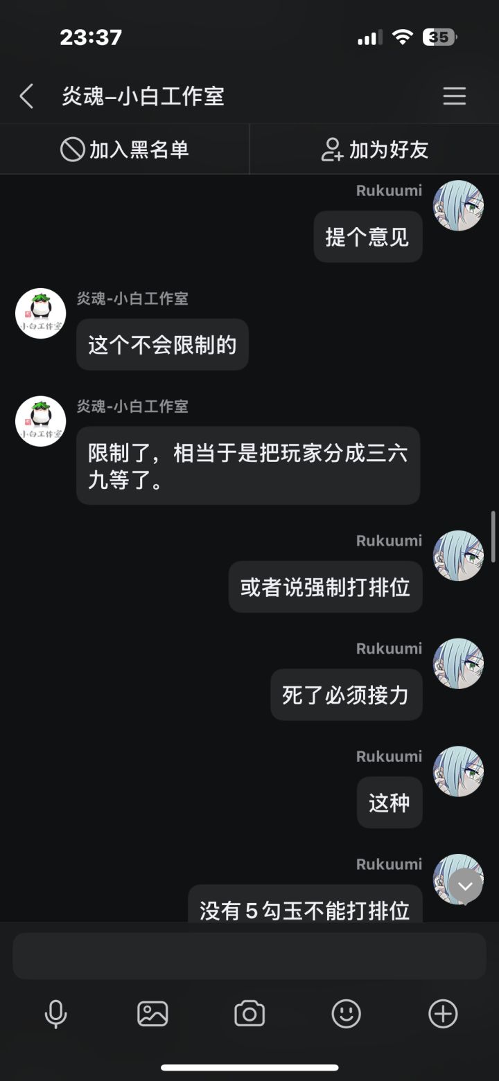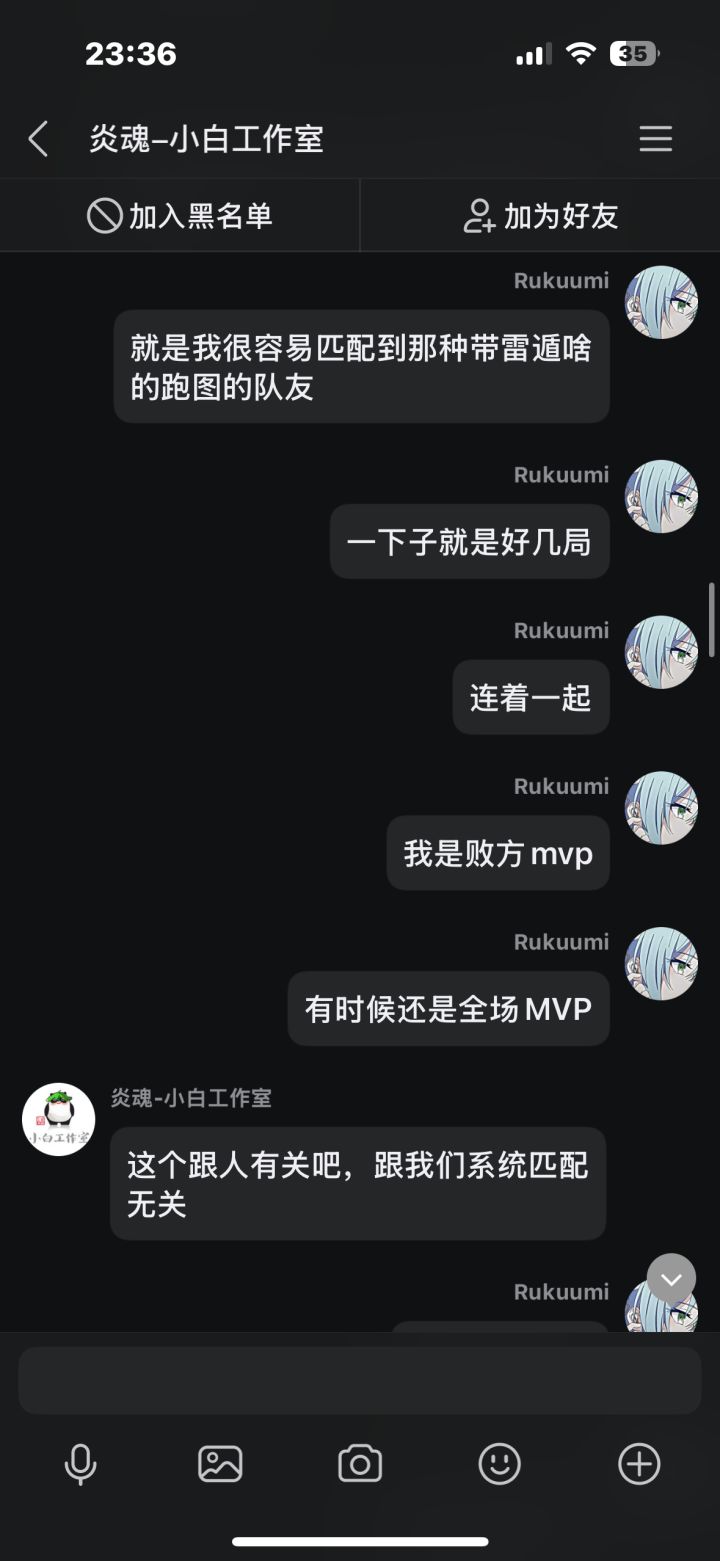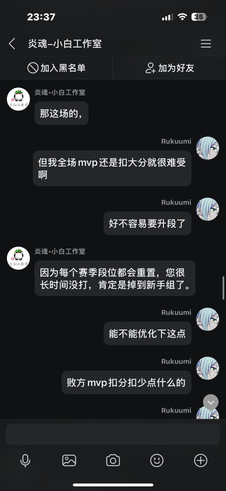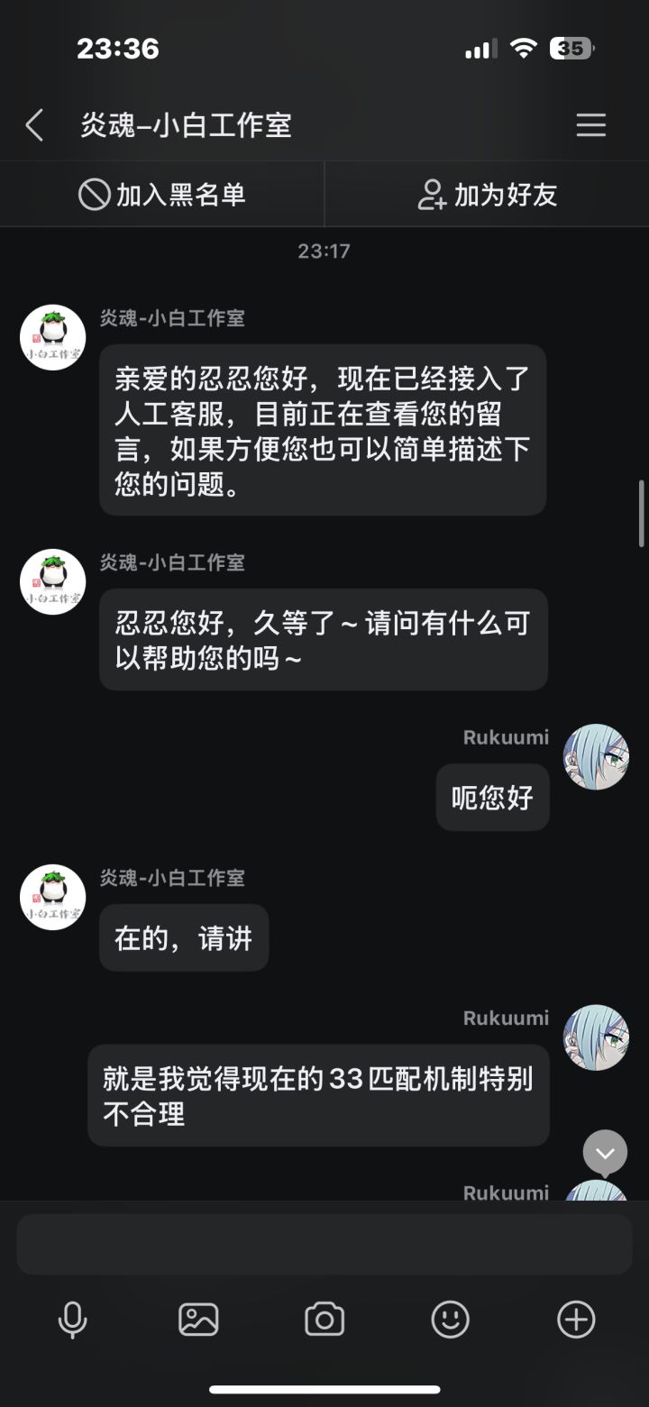 在先前我打了几把排位,中途有个两三天吧,每把都因为队友坑而掉段,我本身也是个回游玩家,打几把排位连续输,后面给我干红温了,结果给我匹配了把人机,跟可怜我一样,我不爽这忍三的扣分机制,就去找客服理论,结果客服不但不安抚我的情绪,反而暗戳戳的戳我的感觉(个人感觉反正让我很不舒服),后面我说了一些我的建议,他给我一一反驳了,给我的感觉也是态度很不好啊,后面我说匹配到五个人机这件事,他硬说这不是人机,我看