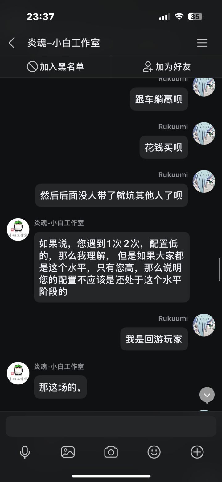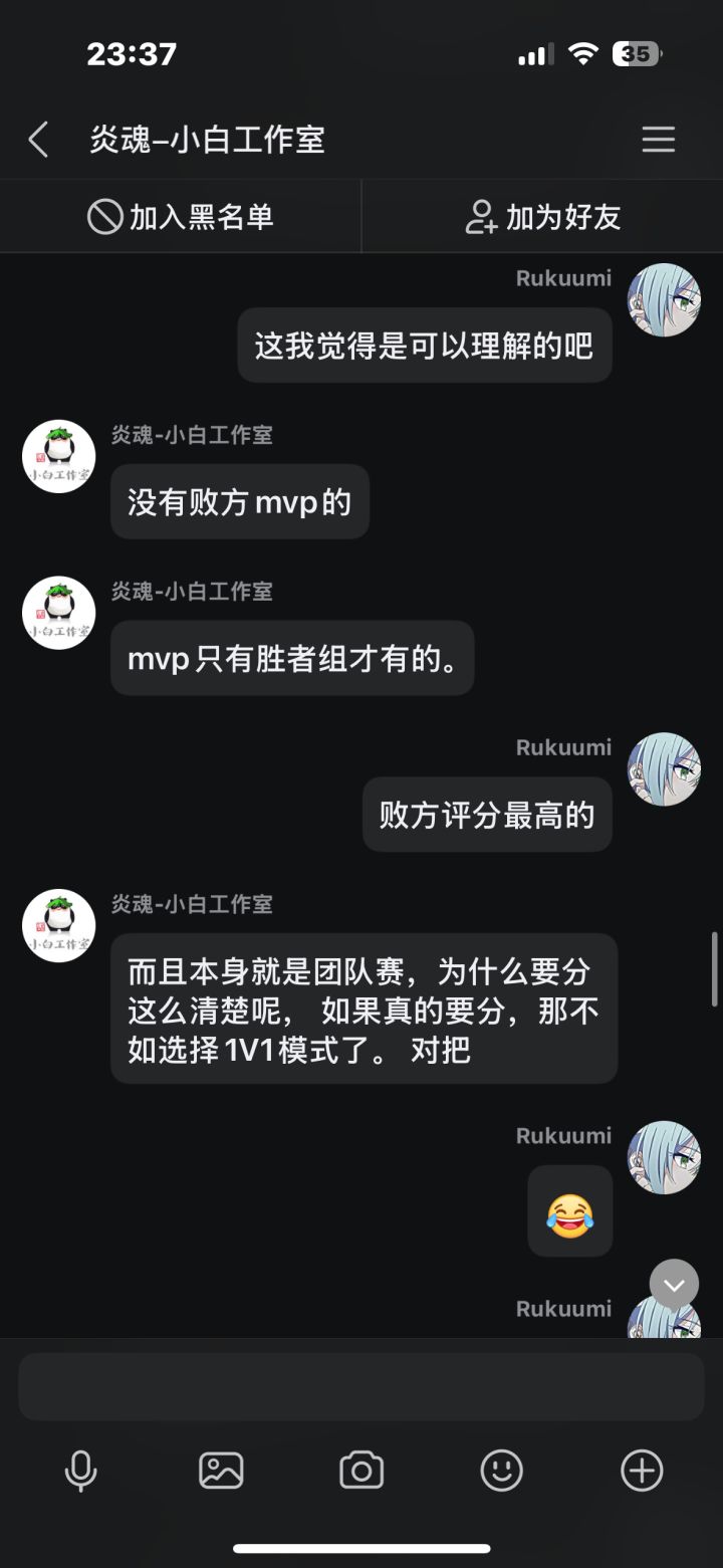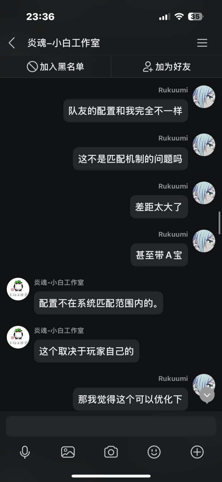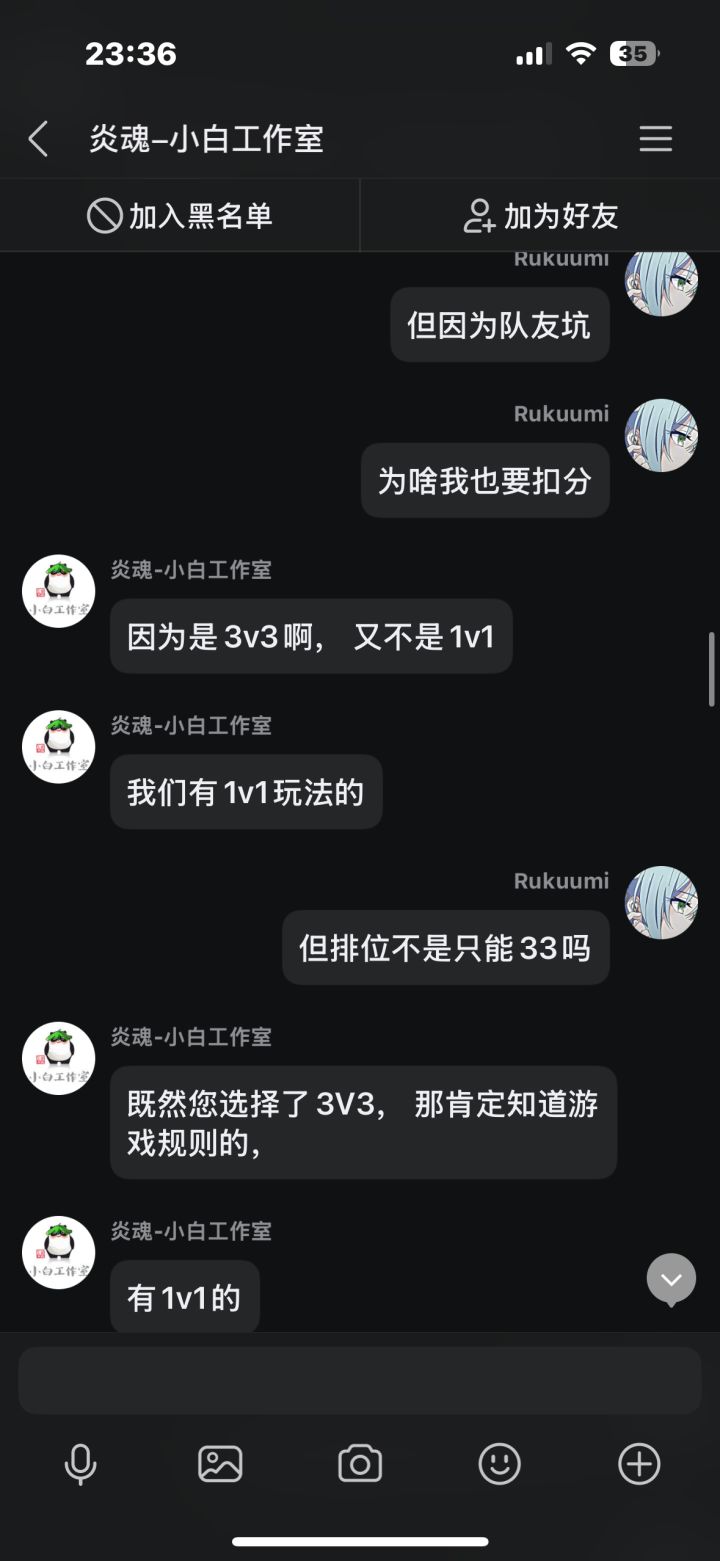 在先前我打了几把排位,中途有个两三天吧,每把都因为队友坑而掉段,我本身也是个回游玩家,打几把排位连续输,后面给我干红温了,结果给我匹配了把人机,跟可怜我一样,我不爽这忍三的扣分机制,就去找客服理论,结果客服不但不安抚我的情绪,反而暗戳戳的戳我的感觉(个人感觉反正让我很不舒服),后面我说了一些我的建议,他给我一一反驳了,给我的感觉也是态度很不好啊,后面我说匹配到五个人机这件事,他硬说这不是人机,我看