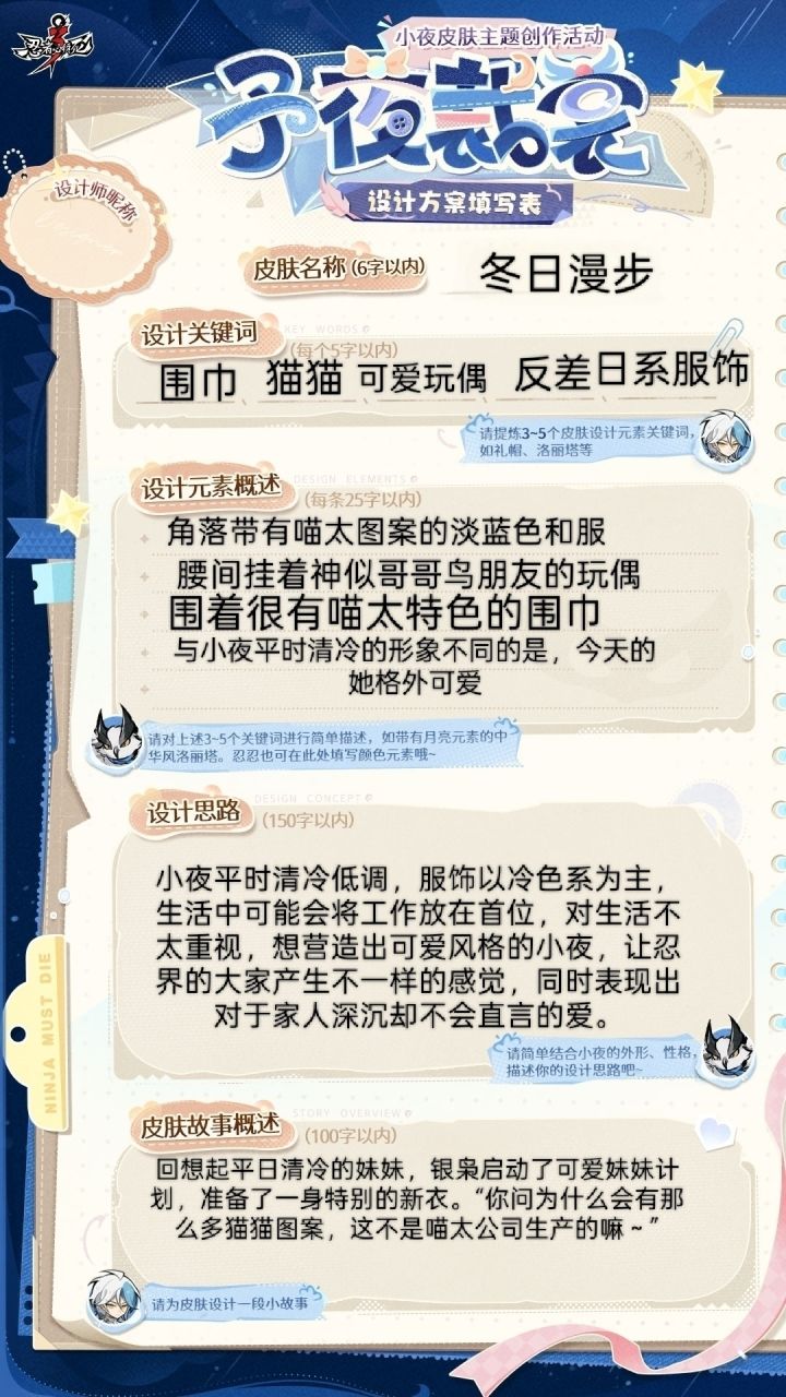 最近几日,夜枭小队的成员总见到自家队长对着一张空白的设计手稿犯难……身为兄长的银枭欣慰地见证了妹妹小夜的成长与蜕变,为了庆祝小夜如今能够独当一面,他决定送给妹妹一套量身定做的新衣作为礼物。然而术业有专攻,在情报网中游刃有余的银枭面对服装设计图纸却犯了难。于是,银枭特向广大忍忍发出邀请,愿忍忍们能助他一臂之力,为小夜构思一套独特的皮肤主题。主题不限、元素不限,忍忍们的创意将成为这份礼物最关键的一