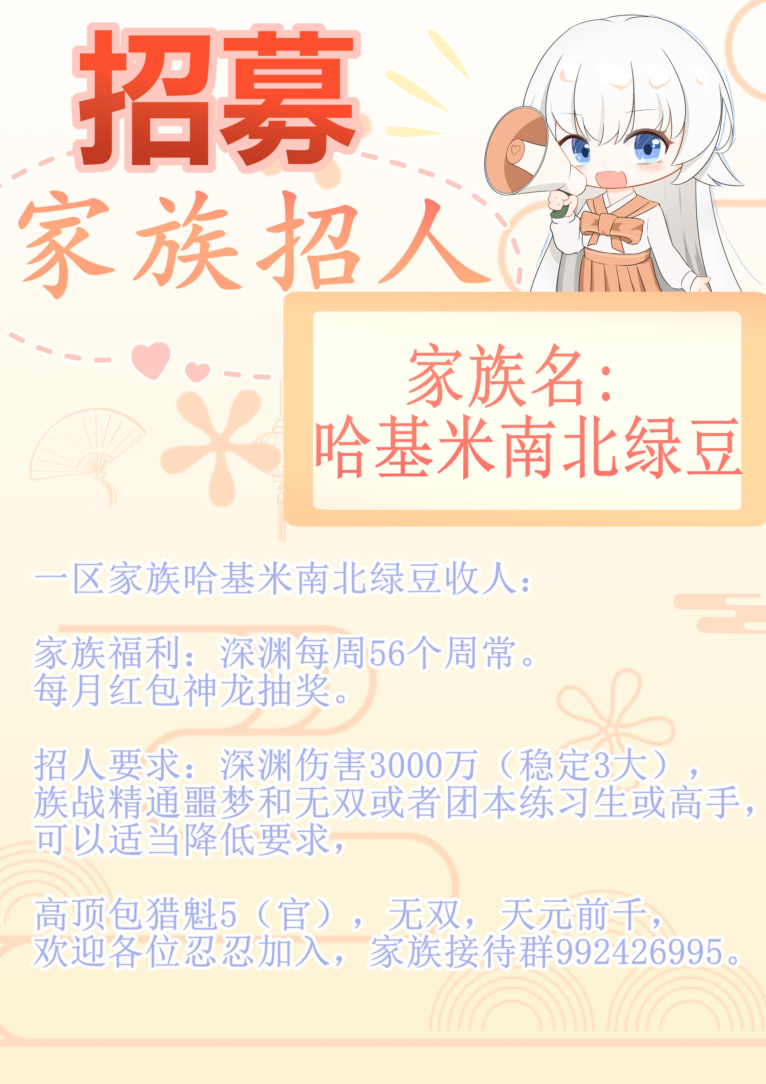 一服雨夜花招人,联赛家族,深渊上周全国排名20名,(因本周深渊不计分放假,故排名不计数)本周深渊64层,冲66!!要求:深渊尽量拉满,有事可请假,深渊听指挥福利一:定期抽取故事章节满星(如满可换周常),包括各种竞技场及周末活动。福利二:每月会有不定期忍三周边,红包,神龙(具体视深渊情况抽取,每个月都会抽)福利三:家族高配会稳定带每位小伙伴所有忍三活动(传颂,逆袭),帮打所有六星ss+,且大