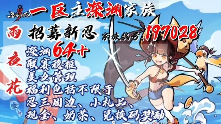 一服雨夜花招人,联赛家族,深渊上周全国排名20名,(因本周深渊不计分放假,故排名不计数)本周深渊64层,冲66!!要求:深渊尽量拉满,有事可请假,深渊听指挥福利一:定期抽取故事章节满星(如满可换周常),包括各种竞技场及周末活动。福利二:每月会有不定期忍三周边,红包,神龙(具体视深渊情况抽取,每个月都会抽)福利三:家族高配会稳定带每位小伙伴所有忍三活动(传颂,逆袭),帮打所有六星ss+,且大