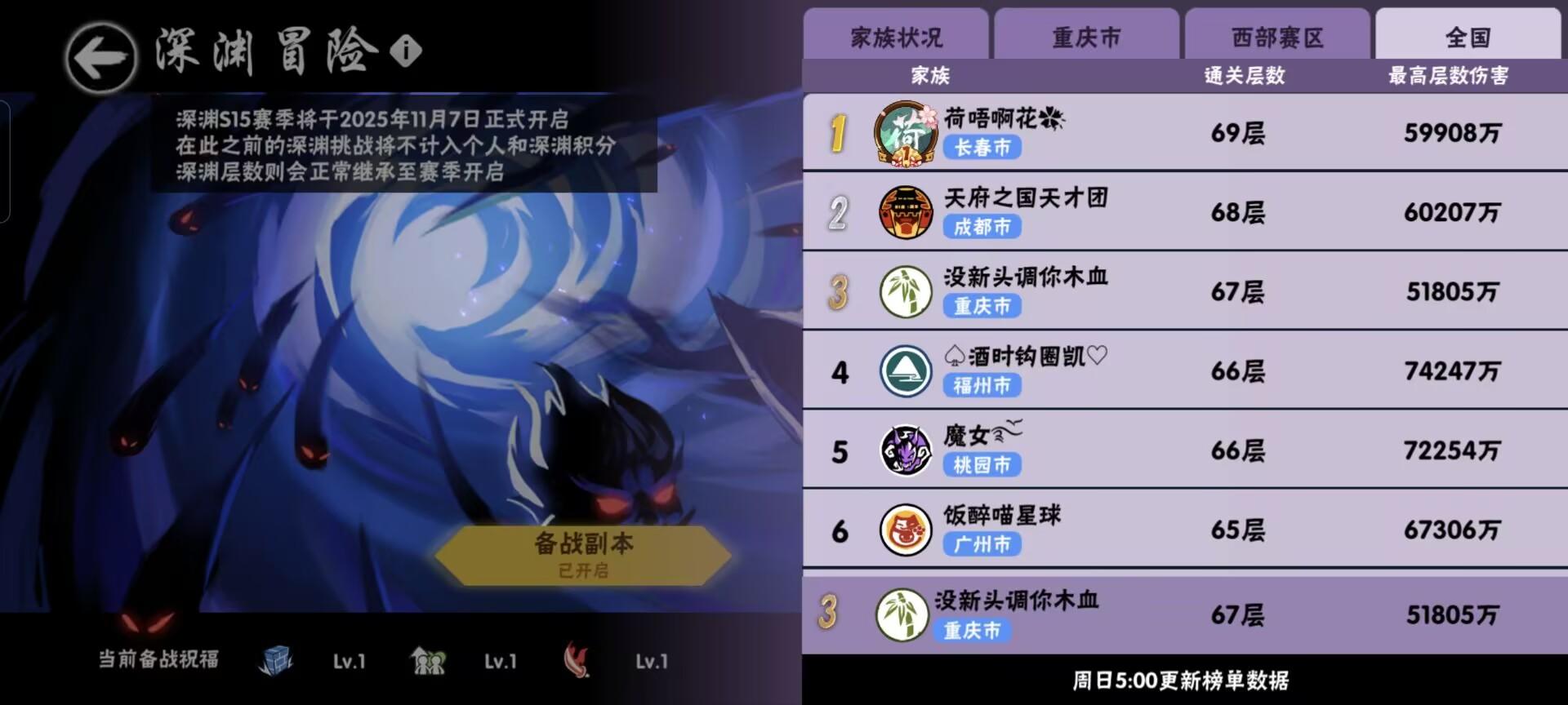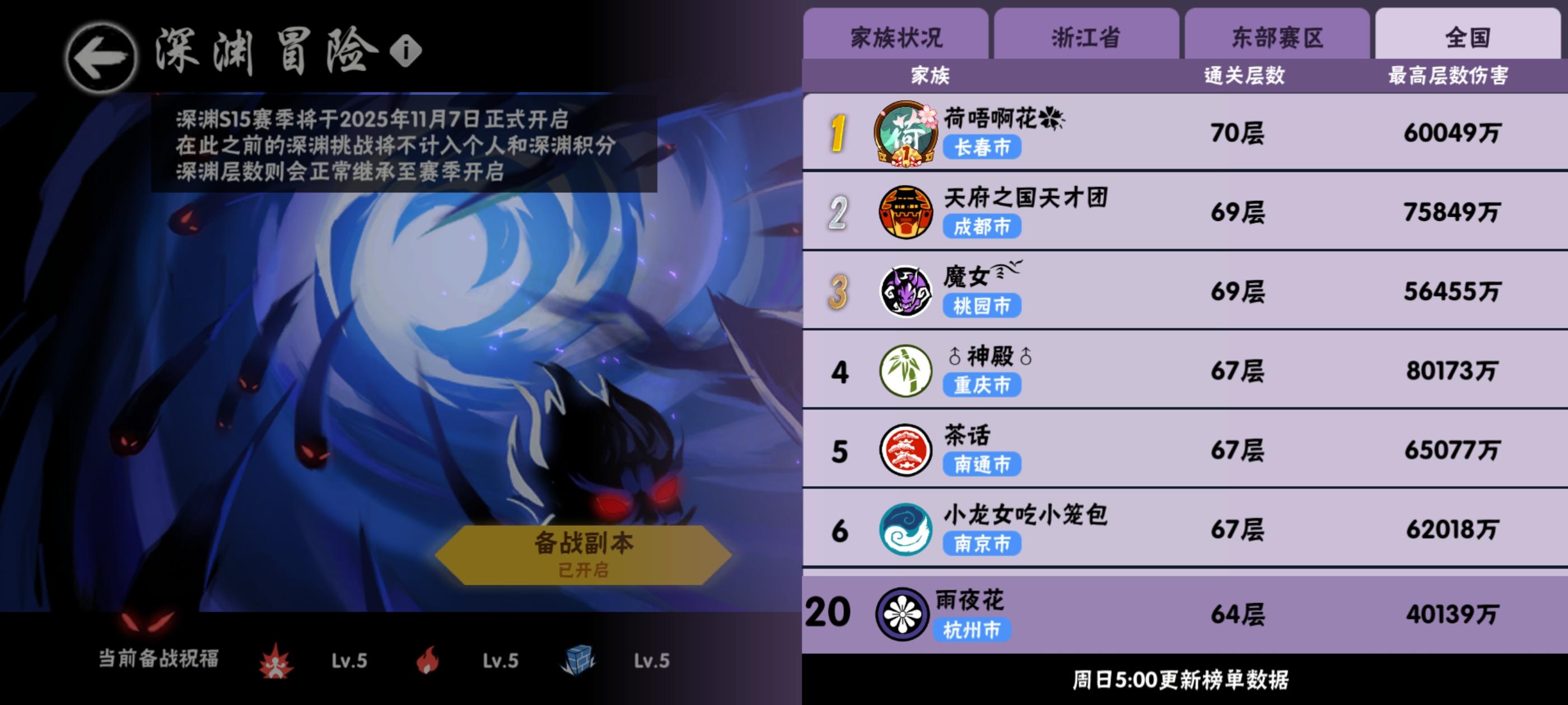 深渊S15赛季啦,一区910JQK招人双修家族,族战东一国三,上届深渊国八团本要求:西瓜315 蝙蝠395 河豚195 金币3080神木130 礼袋75 烟花78 森林2390八选六福利详谈,可提供团本账号练习深渊新赛季第一周拿下东一国四,已过66纯深渊选手要求如下:1. 态度端正,稳定听指挥拉满,来不了要请机甲师,周五前打完备战2.有62+高层深渊经验,排名靠前最好3
