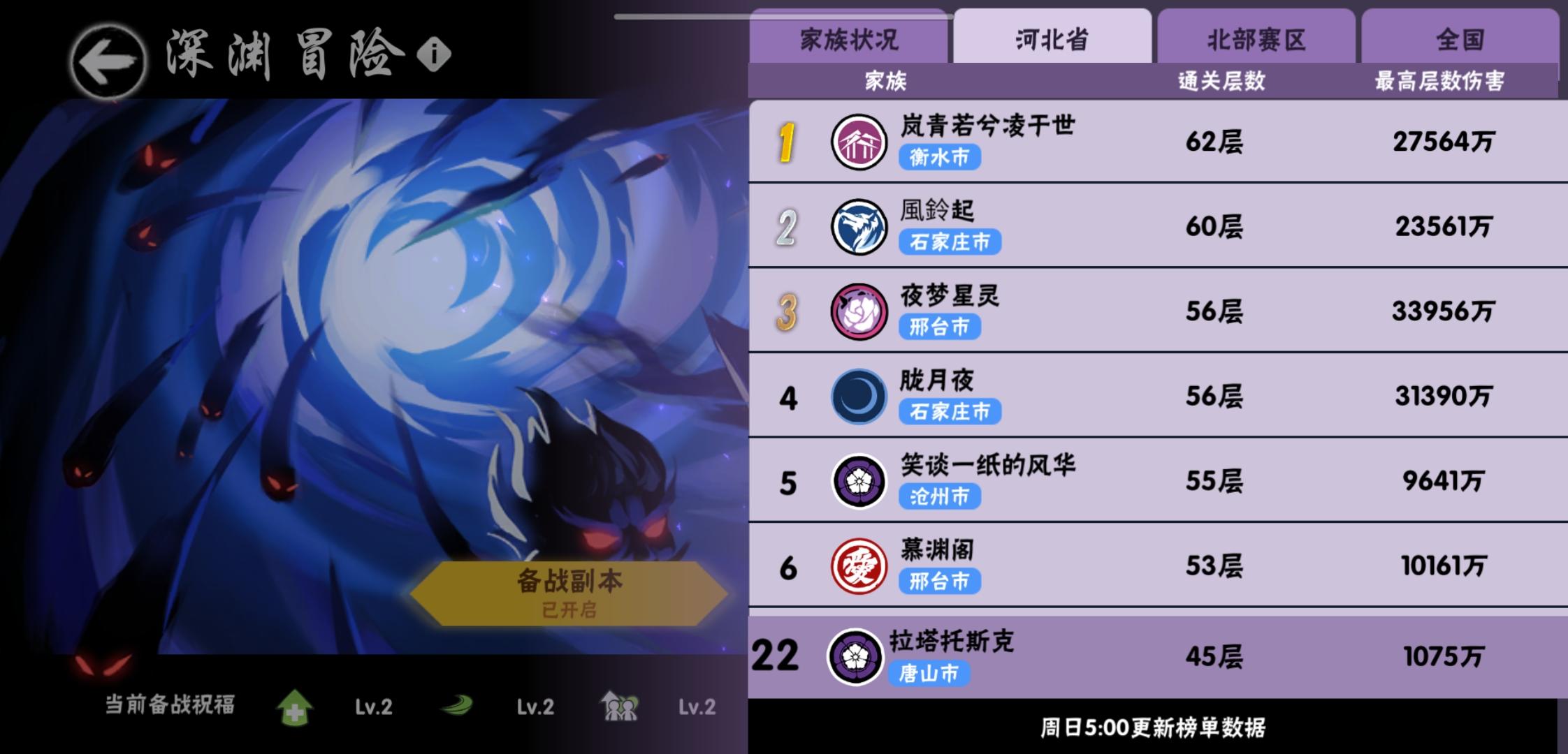 一区家族南秋 🎁家族福利: 每周都会发车带周常,深渊拉满即可上车,常驻高配沙漏号可帮忙刷魁,每周都会抽人帮助剧情、竞技场、工坊等,不定时会有更多福利掉落。✨家族概况: 主深渊,族战稳联赛,深渊百强,深渊60+🎈家族要求: 要能常参加深渊,一个月最多请假或混深渊两次,其它时候需要拉满,拉满伤害能到达4000w以上,族战不要求,可自愿参加。🎉诚挚欢迎各位大佬以及活跃忍忍。如果您有加入我们