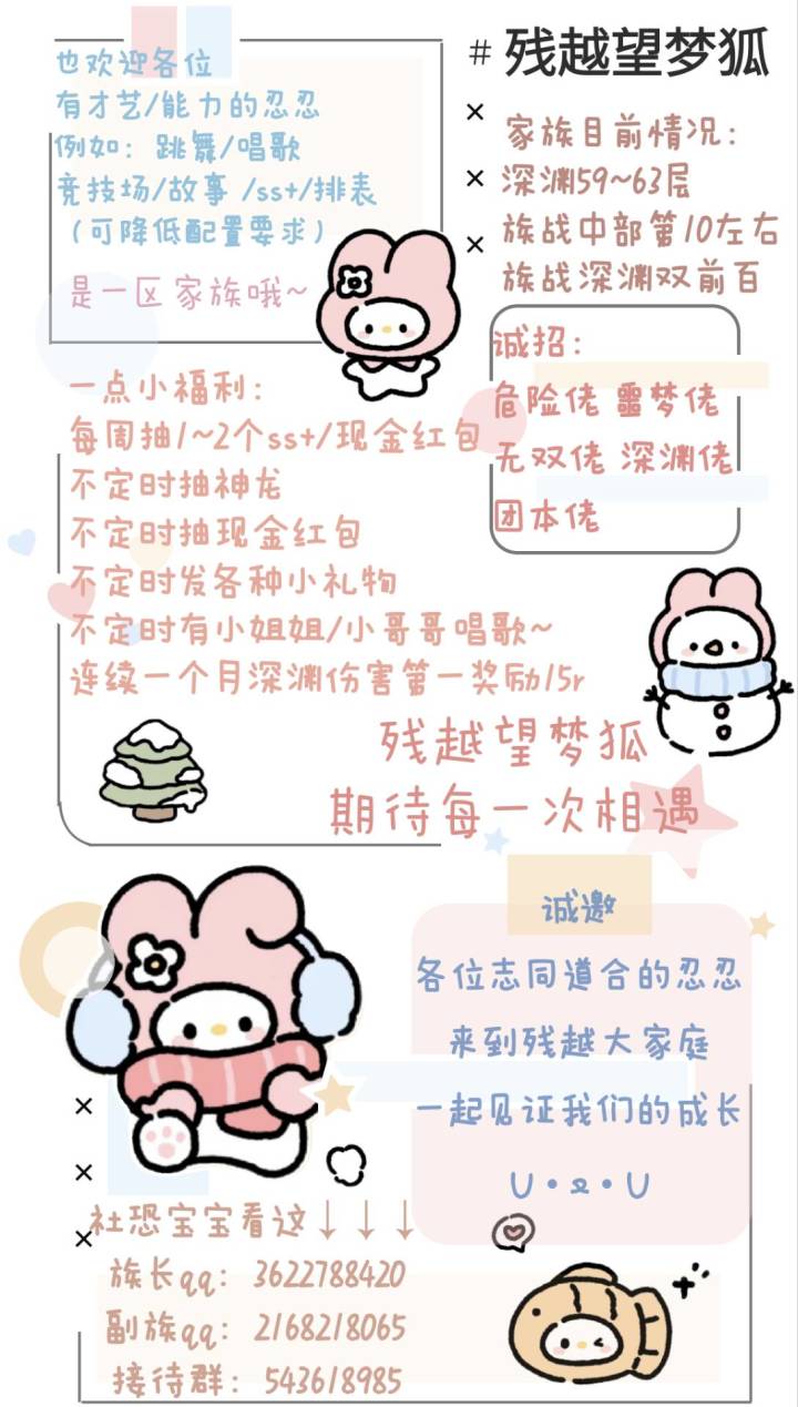 审核q群:239077907 (qv分批管理)深渊稳68+冲70+ 家族招人 (1区杨柳楼新月) 小小要求:命格6+5+4,忍宗/抄3+3+0(没有那么绝对)敲重点:只收常驻,不要在周三-周五期间退家族 1.建家族的初心是重视到每一个人,希望大家都能遇到真正的好朋友。成绩不是目的,大家的游戏体验需要人数和质量(没有团队意识的勿扰)咱是尽量重视到每一个人的大家庭 2.深渊稳68+,属性好可#忍者必须死3