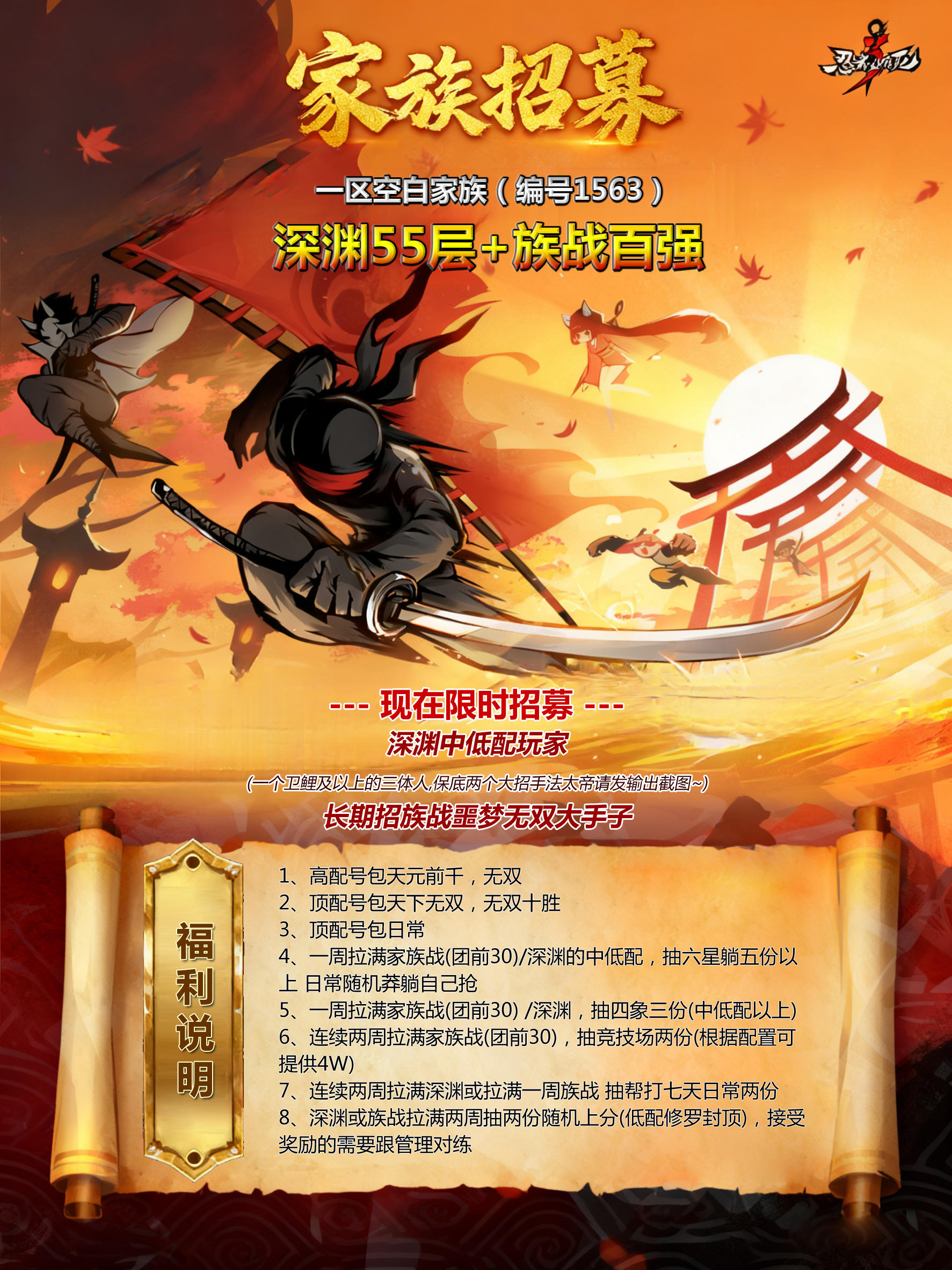 一区繁星•春水漾招人啦!1.家族对配置没有要求,只要活跃愿意参加深渊和族战就可以,目前也比较养老深渊可以混3,深渊可以好好打的尽量认真打,有红包福利哦2.家族深渊目前稳定50+,努努力可以破52,欢迎各位大佬的加入3.福利:每个月深渊月底结算会抽神龙,竞技场包月,还有周末千框等等福利。有时也会布置一些团本作业,努力的玩家也是会有周常的4.招高顶配大佬主流忍者六命就行有滴更好,可以免费帮忙机