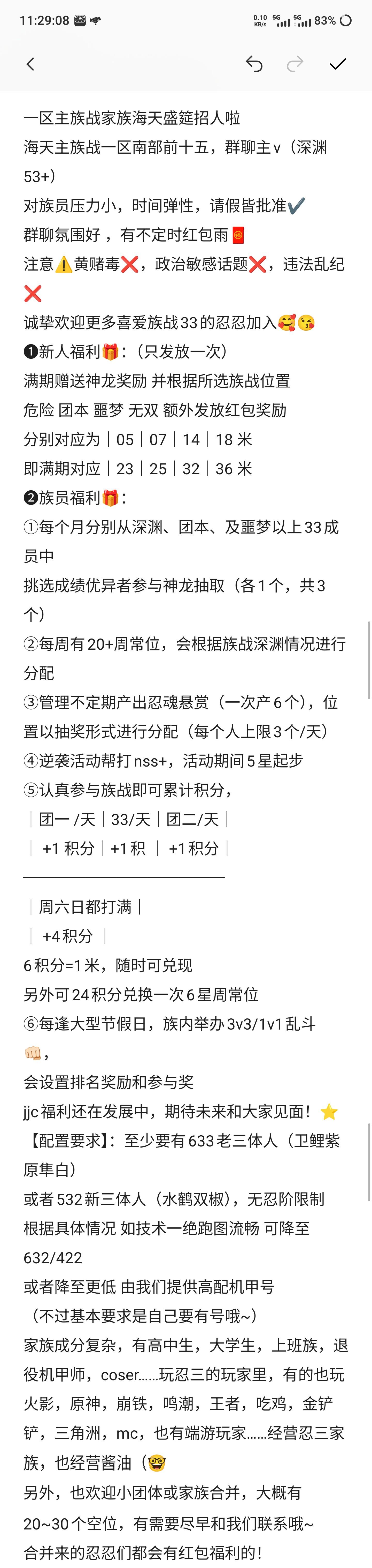 一区繁星•春水漾招人啦!1.家族对配置没有要求,只要活跃愿意参加深渊和族战就可以,目前也比较养老深渊可以混3,深渊可以好好打的尽量认真打,有红包福利哦2.家族深渊目前稳定50+,努努力可以破52,欢迎各位大佬的加入3.福利:每个月深渊月底结算会抽神龙,竞技场包月,还有周末千框等等福利。有时也会布置一些团本作业,努力的玩家也是会有周常的4.招高顶配大佬主流忍者六命就行有滴更好,可以免费帮忙机