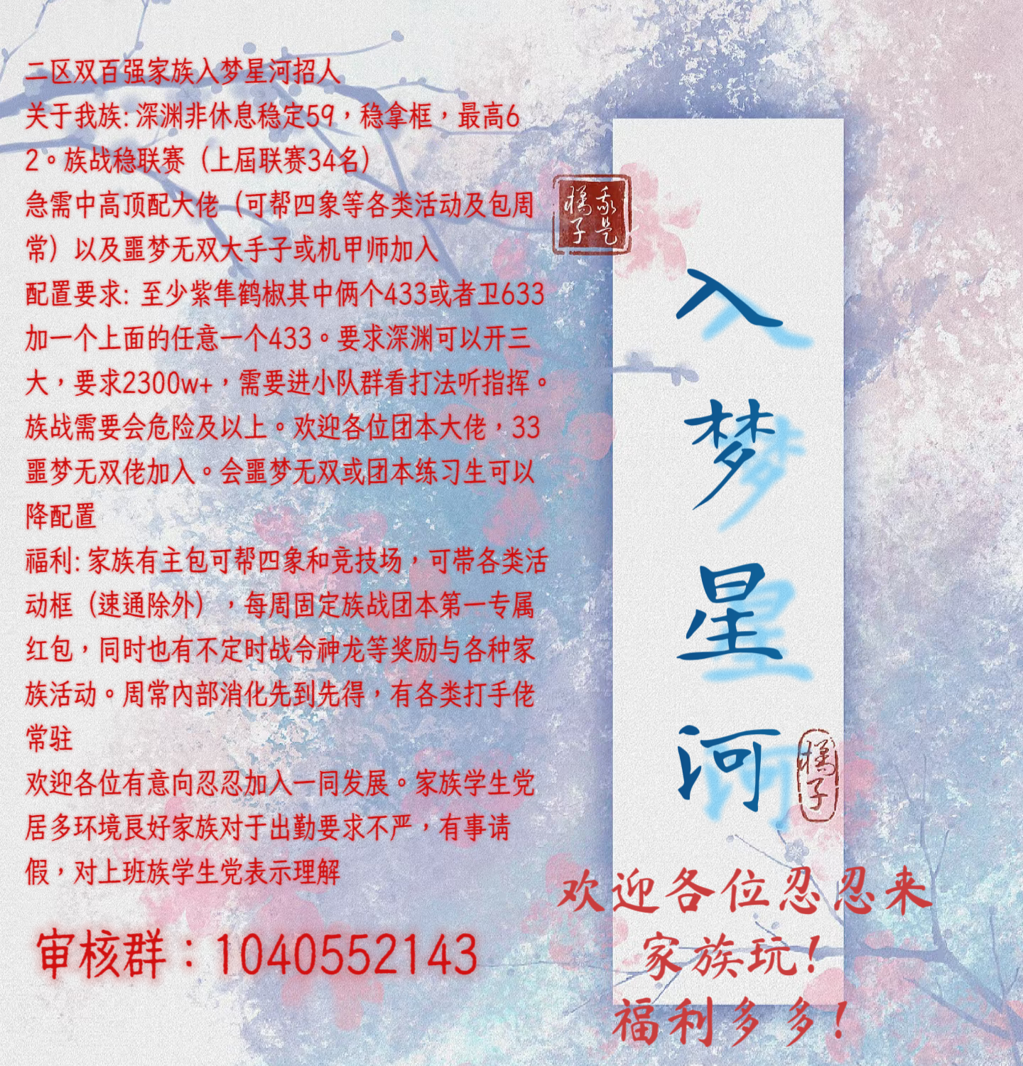 二服家族入梦星河招人,福利多多族长会女装(QQ相册有照片)我们的实力:族战常年前五十,深渊也前五十,深渊保底58最高61(62差一丝过)欢迎各路实力选手加入,家族环境好无黑历史,如果后续因出勤(不请假缺席)#忍者必须死3二区招人 #忍者必须死3深渊家族招人 或面板问题需让位家族有合作下放家族可以去,下放人员照常参与主族悬赏令福利,有能力可继续担任机甲师二区双百强家族入梦星河招人深渊稳定58