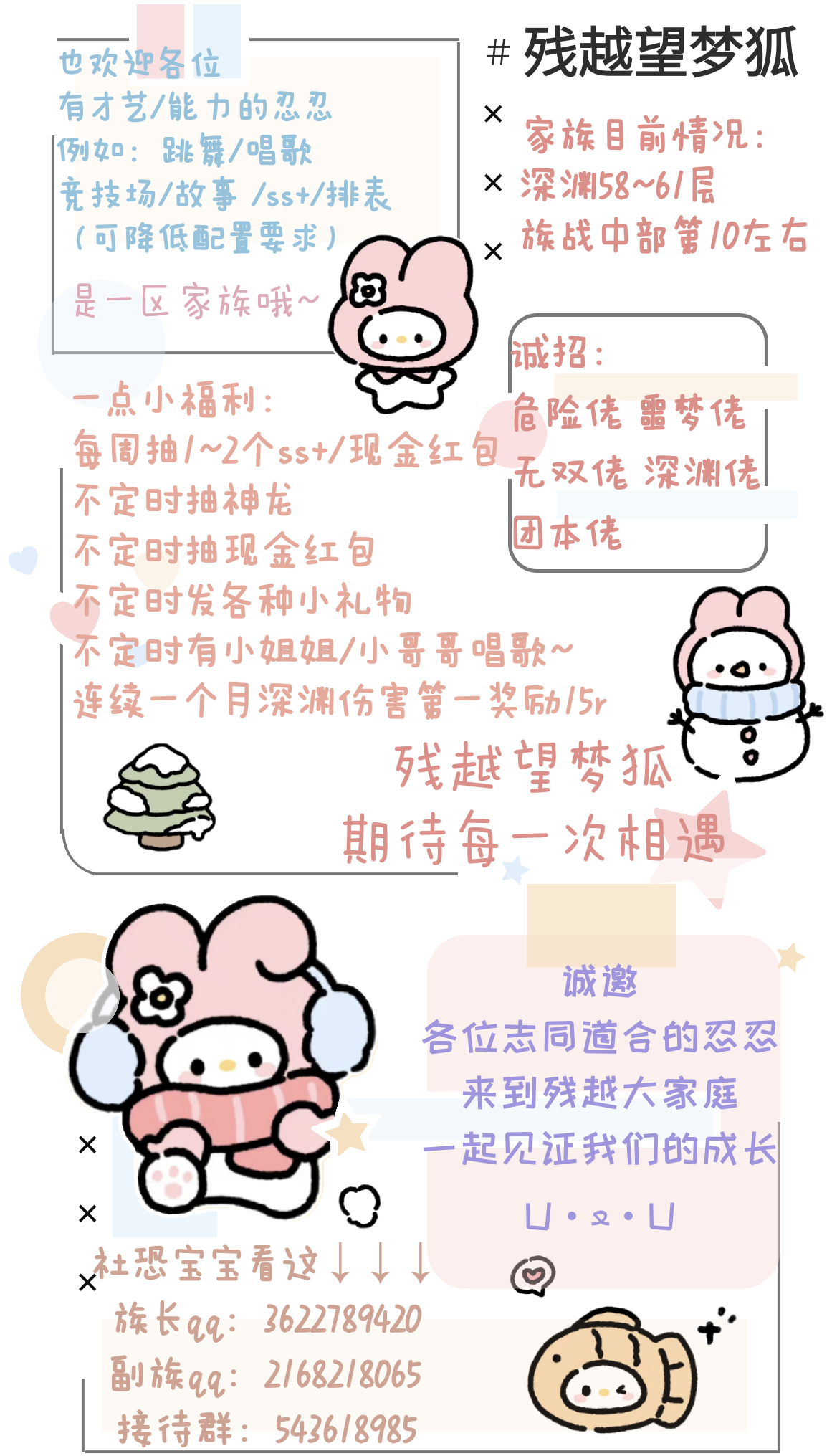 一服雨夜花招人,联赛家族,本周深渊62层,冲65!!要求:深渊尽量拉满,有事可请假,深渊听指挥福利一:定期抽取故事章节满星(如满可换周常),包括各种竞技场及周末活动。福利二:每月会有不定期忍三周边,红包,神龙(具体视深渊情况抽取,每个月都会抽)福利三:家族高配会稳定带每位小伙伴所有忍三活动(传颂,逆袭),帮打所有六星ss+,且大部分ss+都可32。审核群号:571881041