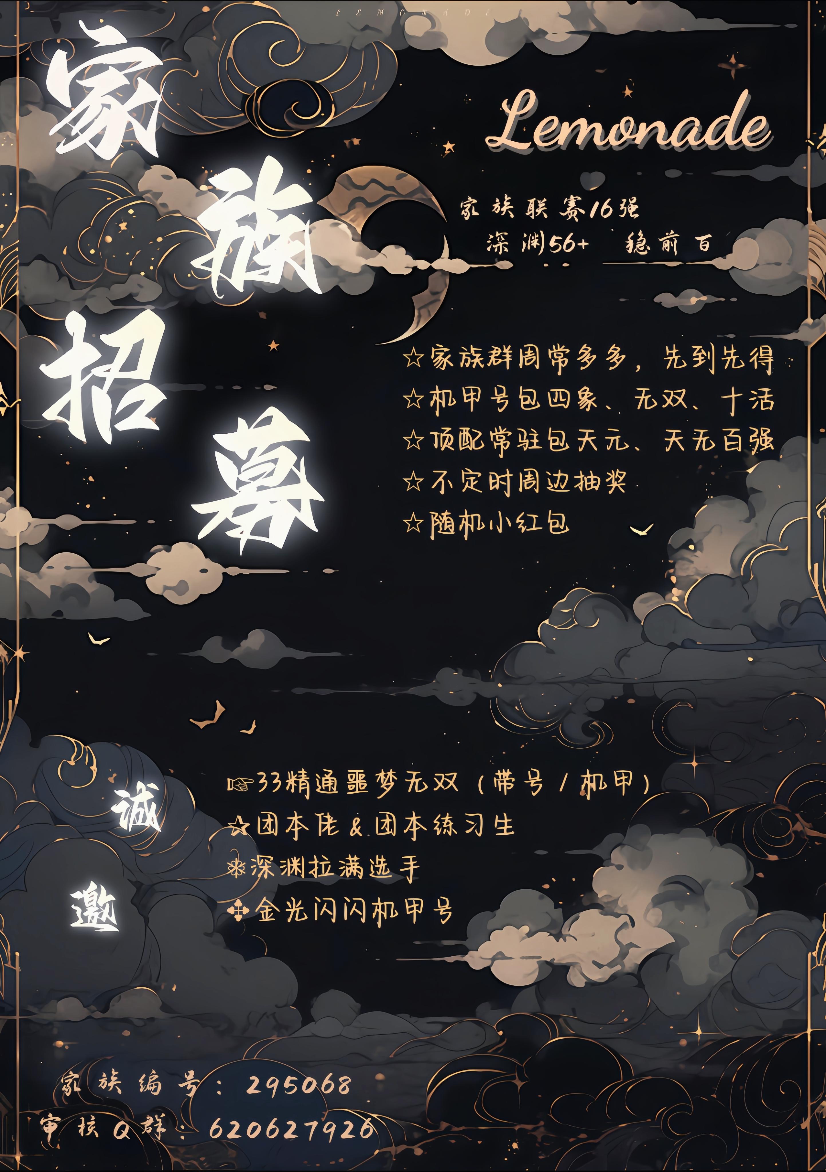 和の国(一服) Lemonade 持续招人中~ 深渊56+ 稳前百 主族战 本届联赛四强 家族编号:295068 审核Q群:620627926 ★诚邀: ①33糕手(带号or机甲师) 精通危险/噩梦/无双 ②团本佬&团本练习生 神木132 金币3050 森林2400 礼带75 烟花75 河豚193 西瓜315 蝙蝠390 练习生要求可以差一点,但要有尽快练满的决心,提供近期稳