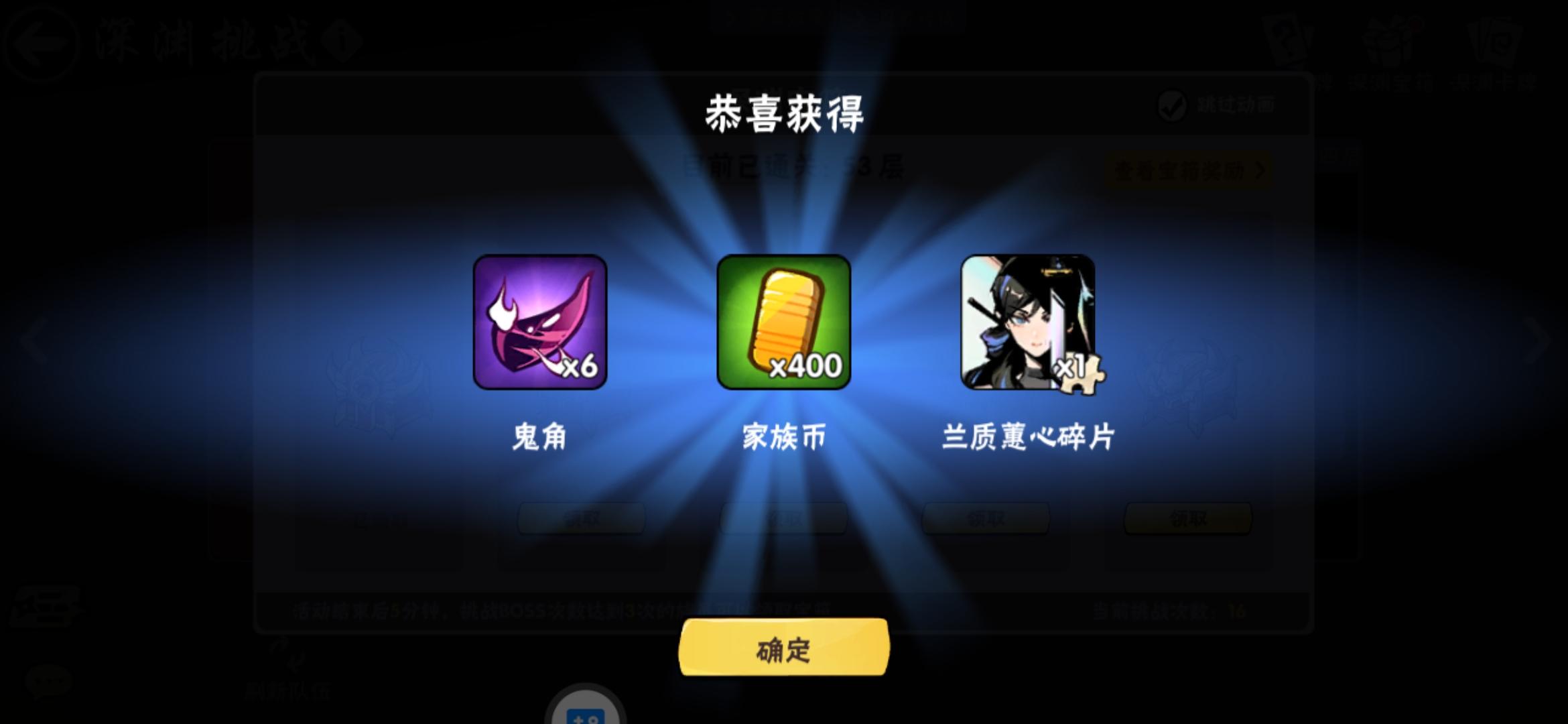 从6月份开始到8月份一共8次深渊我打了7次有一次出去玩了混3,还8次能出兰芝的宝箱大概也就12个左右我就出了一个兰芝碎片(我也忘了当时是什么样的心情)后面8月份把兰芝作为追求的让我太累了就回归原始了。有人建议我换个家族(深渊层数更高的)。当然我拒绝了,去了深渊40+的家族玩。基本算是放弃了。