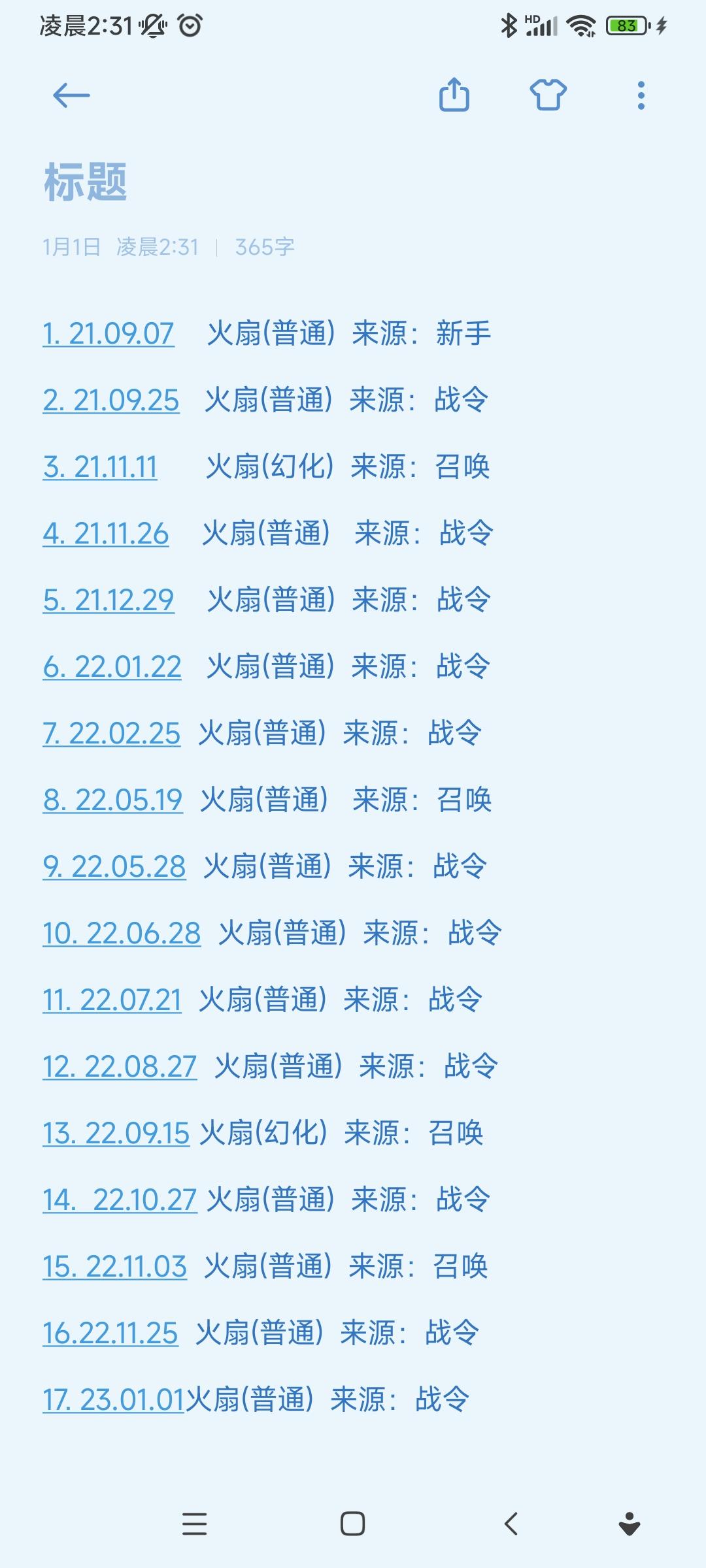 今天又双叒叕出一把火扇,感觉战令似乎全是火扇,突然很好奇一共出了多少把,就想翻相册整理一下(可能不全),整理完吓了一跳😓,如图,16把火扇,所以大家以后叫我火扇公主就对了😏差不多火扇占了我玩忍三这么久以来近半的SSR了(而且还是不完全统计)