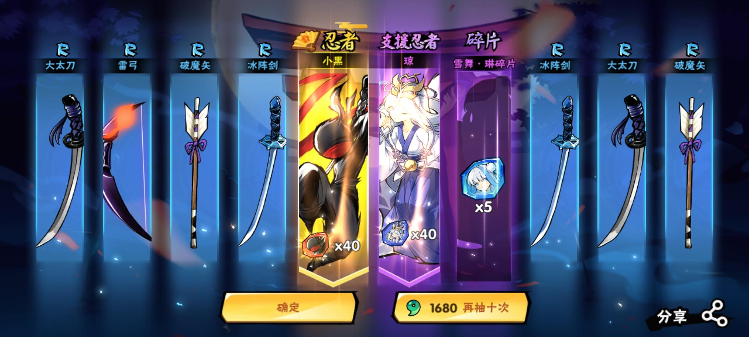 事情是这个样子的,看到三个结神符,手痒,抽了吧好家伙,一发入魂...好歹是金色还有两个,抽一个是抽,留着干啥,再来一发嘿,又是一发入魂...不亏结神符都抽了,攒了30个金钥匙,不然也抽了?感觉今晚运气蛮好的整吧,反正我也抽不到幻化,不攒了第一个十连,很好,雷弓,也算是出货吧再补一个 .....好歹双黄蛋?行叭,睡觉