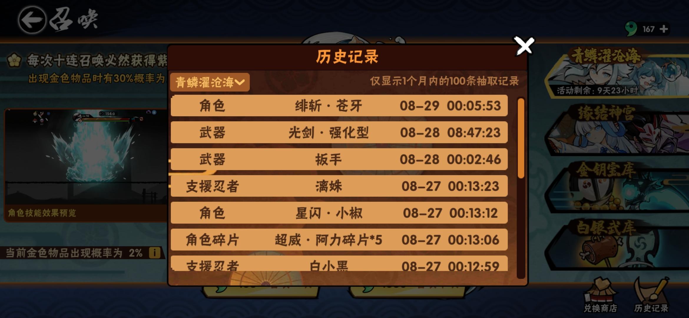 汇报一下这次周年庆的角色池战果吧,一百二十多抽八金,基本上能出的都出了一遍,就出了俩洛青,概率的话就算是百分之二十五也可以接受,基本都是十几发以内出的金(除了老琳的五十一发保底😤😤)