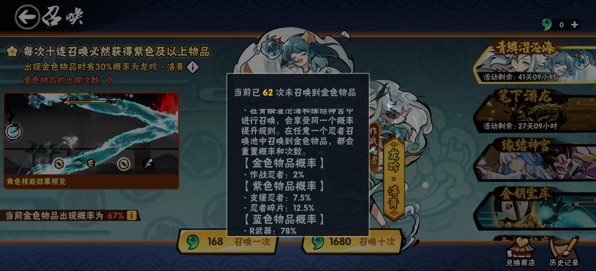 来来来,咱说说这个up,我双号300发6金加起来0洛清(其中一个号190发4金了)如果是单这一次,那算了,咱往前推1.火舞两个号8金中一个,还是吃满五保底2.毛笔第四金才出3.百雷幻化四金出了断潮(出来个水刀)5.星闪up3金0星闪(中了个已经六命的雪舞)6.鹤up4金1鹤(没主流角色)7.铃铛光剑幻化5金一幻化铃铛,但我光剑差一百级(出了个水刀,现在也没用了)8.星闪第一次出,五