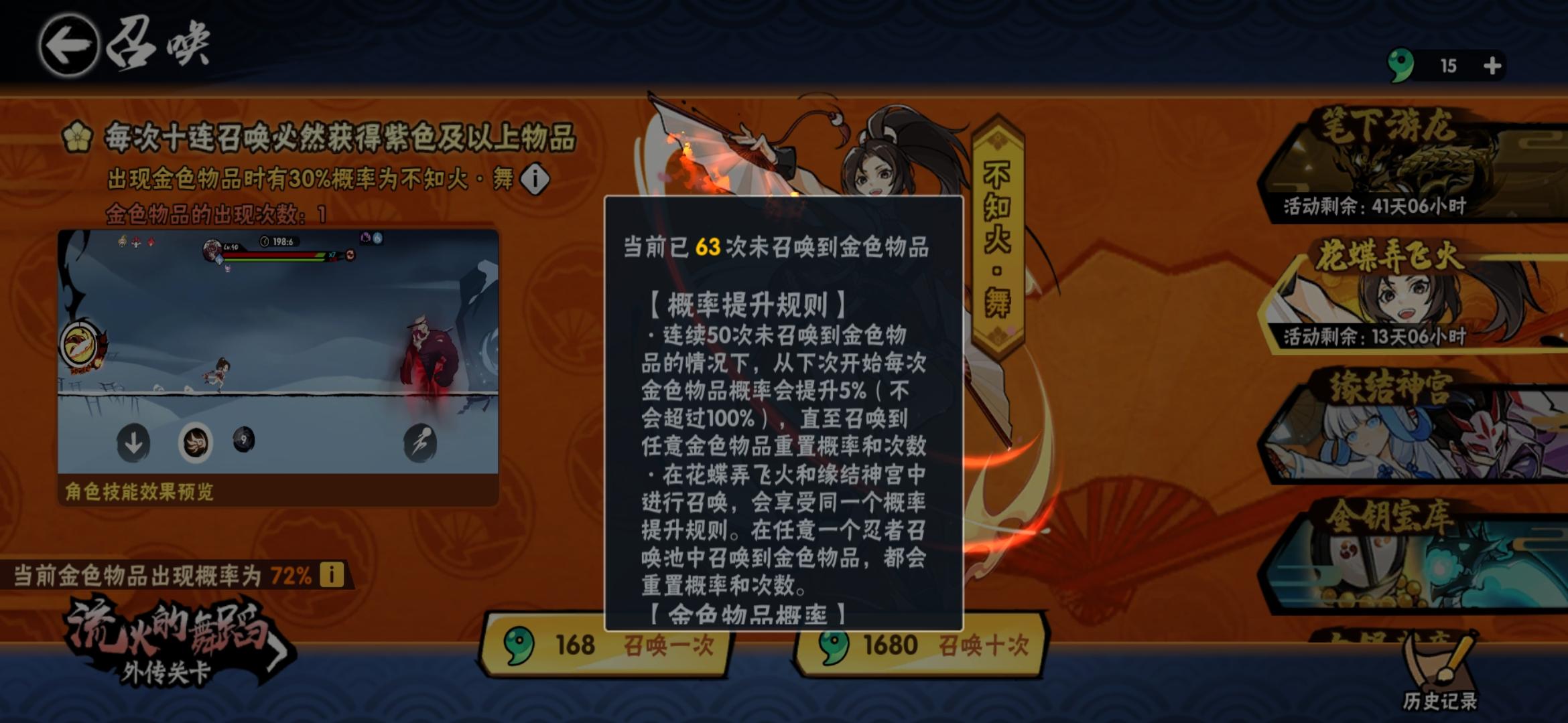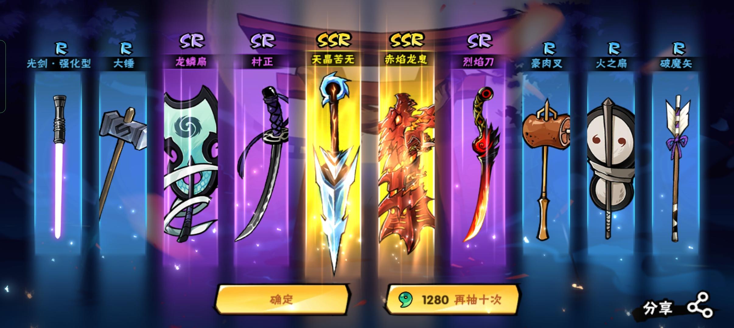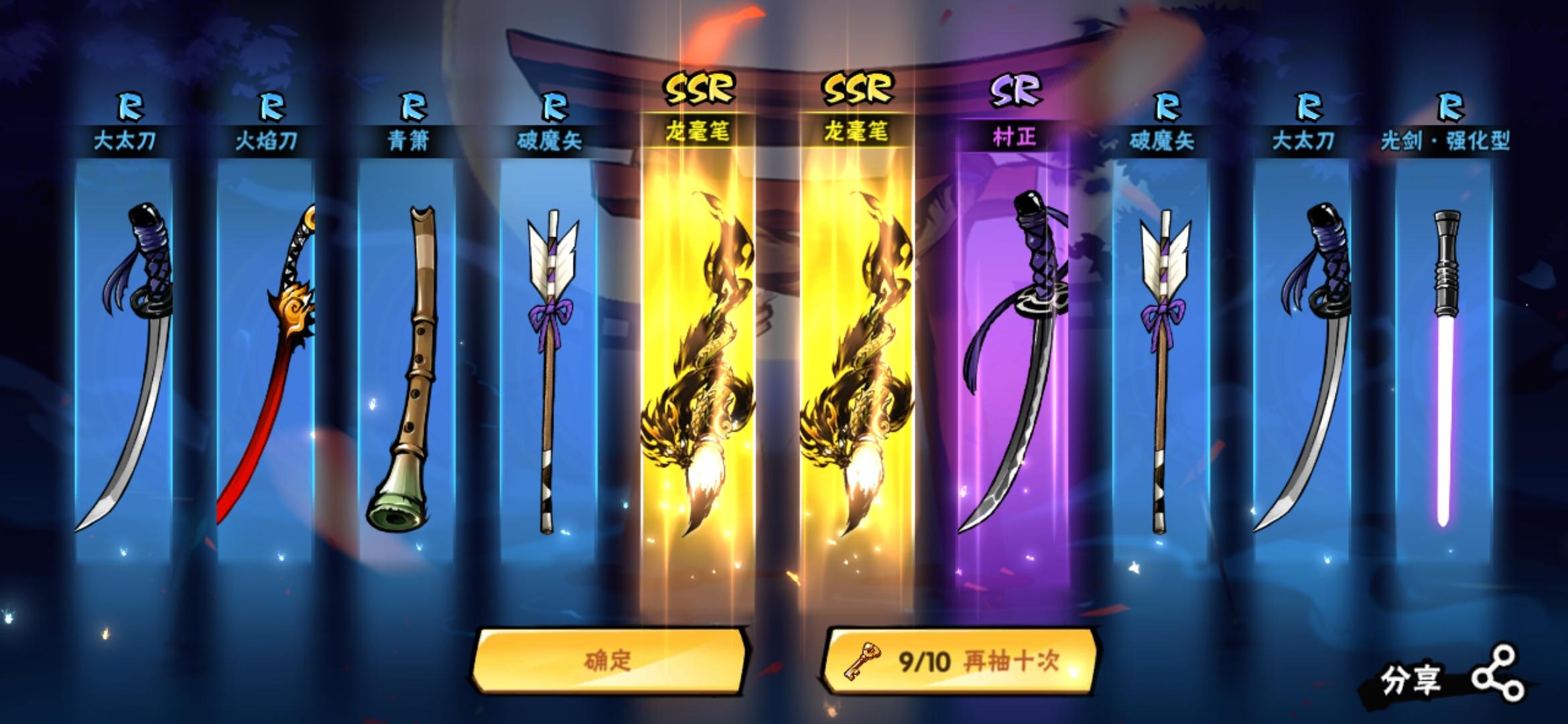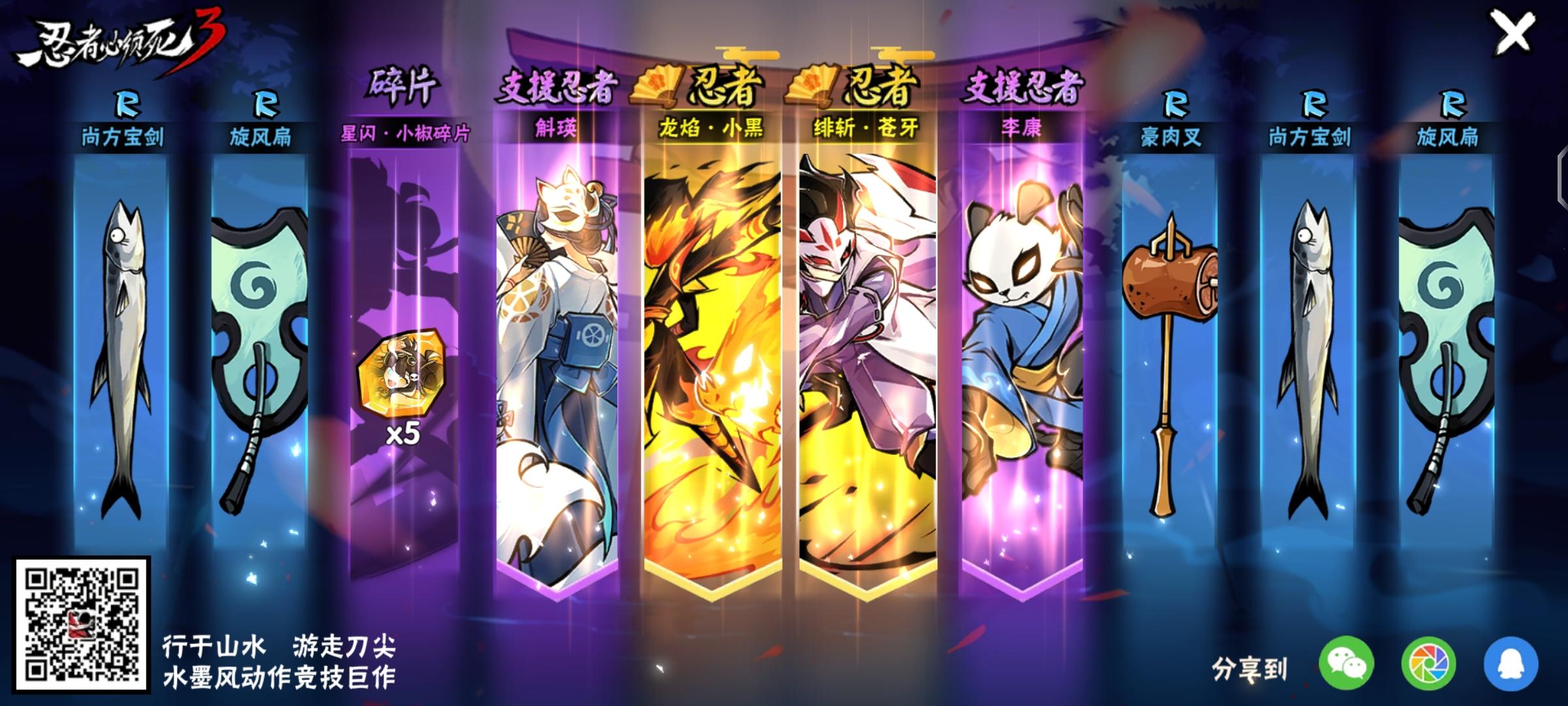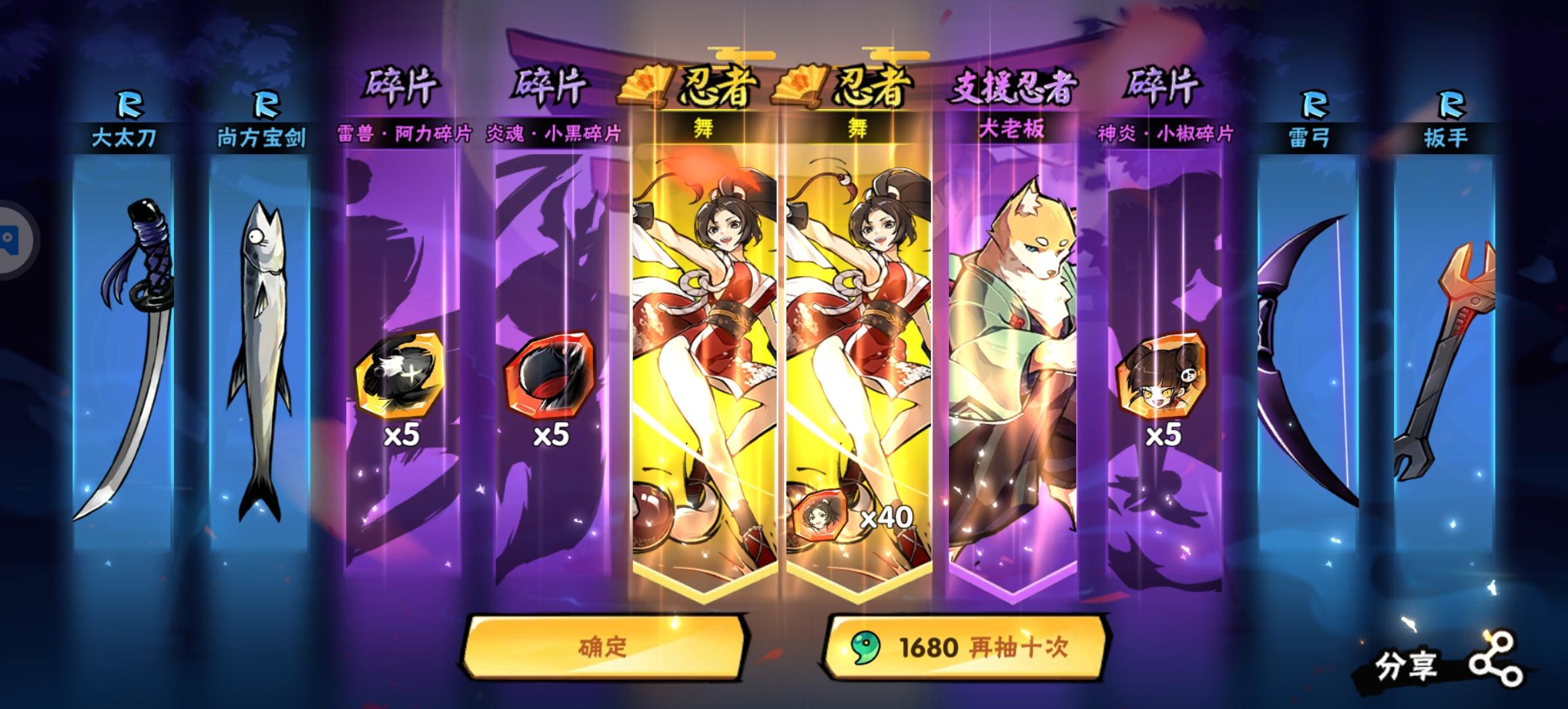 之前玩了几天就不玩了,回来签到领个武器正好有二十连抽,就试试,没抽到就不玩了,但是!!!!!十连俩个金忍者池也抽了一个十连,就抽到了伊鹤小姐姐!所以决定再玩下去吧😭😭