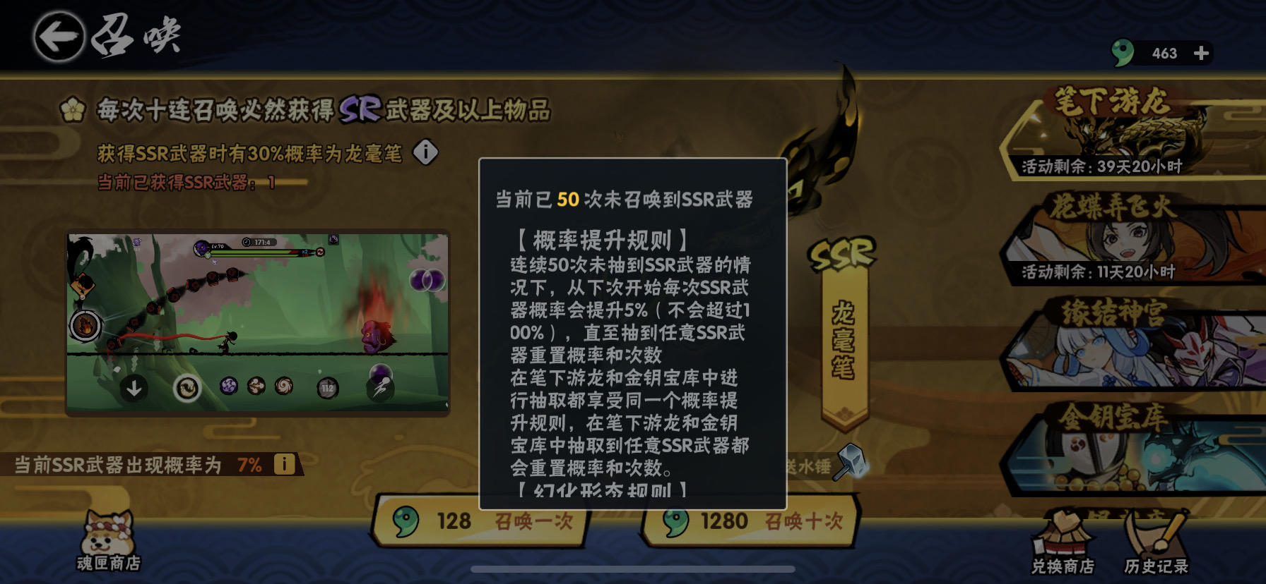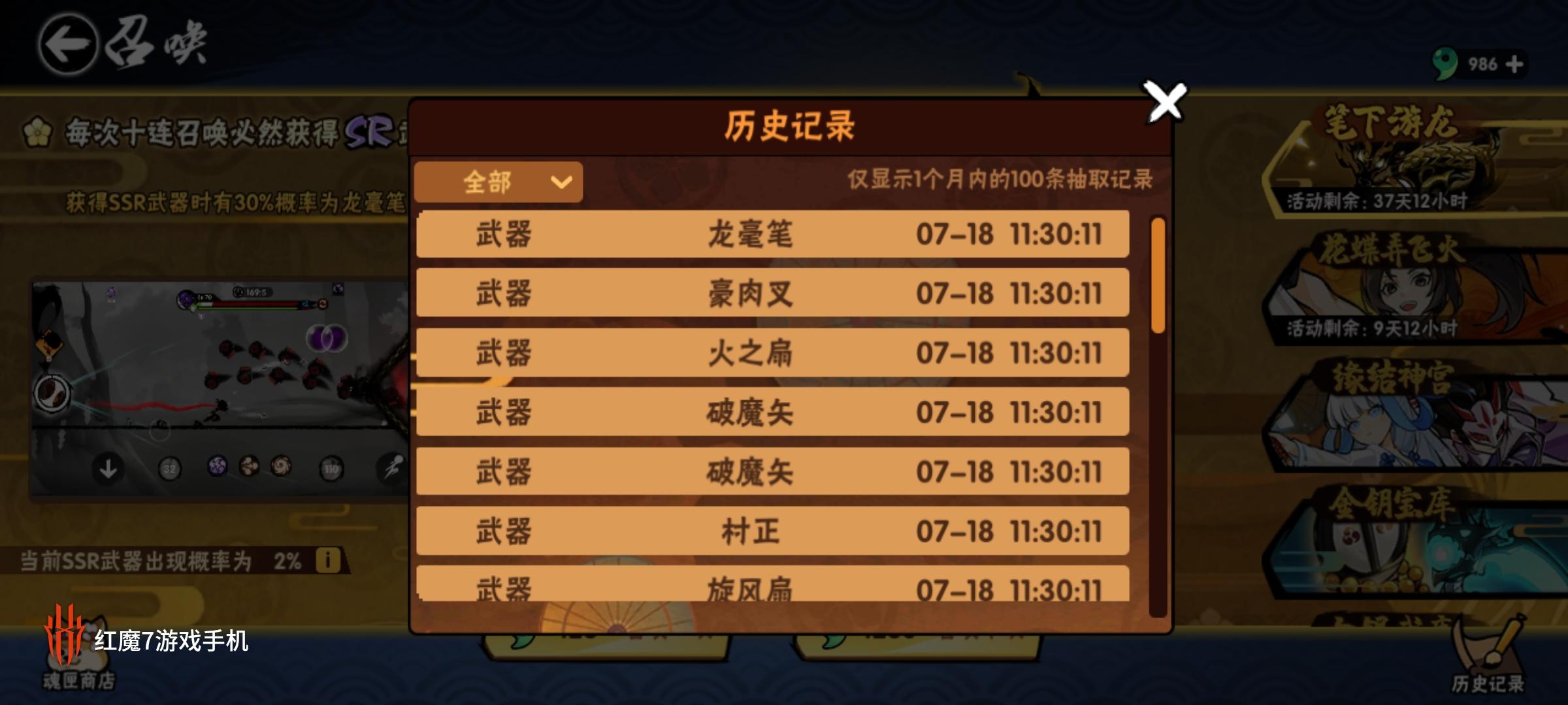 啊?!连金,不光武器,还有人物池,大概不到100抽绯斩雷娇和伊鹤(我中间氪了很多所以没记录)