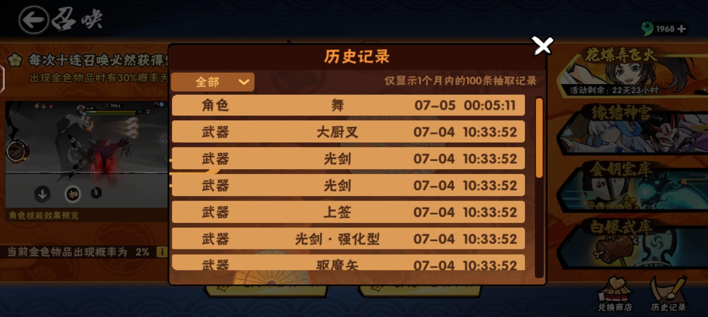 这是一个悲伤的故事。20抽4个金。其中10抽是白嫖的,还有一个超威,忘截图了。我的火舞成功的留在了大保底。