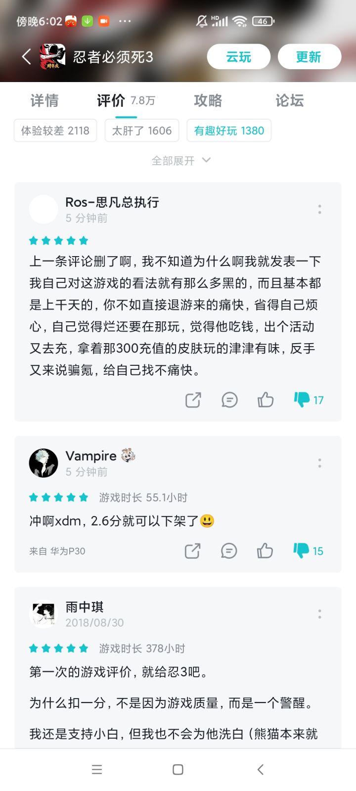 呵,狗白又开始控评了。作为一个20年老玩家退了,这次真的看不下去了。狗白自己心里没点数吗?就知道一天到晚打广告不知道塞了别人多少钱还说自己游戏好,运营也差的离谱,还整天98,128,328你这个基础都没打好它能行吗?😅