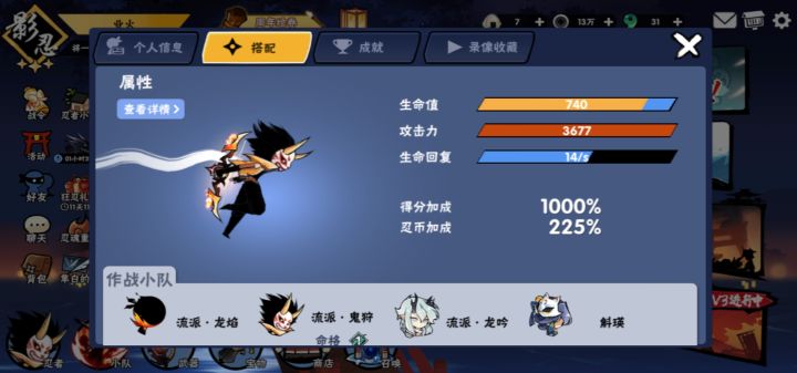 刚刚上线升了下新忍者,总体感觉很不错,在不带任何宝物和只带一级忍刀的情况下开天赋技能可以打10格血一命格(皮肤体验中),还有这个角色的养成耗费的资源还是比较多的,3600左右石头可以点满主天赋和流派天赋,觉醒石100左右即可没有细算,当个参考吧(第一幅图为我的养成,石头至少3400左右忘了多少,觉醒石110+)刚刚也看了汤圆的测评,在不带宝物打沙克的时候打了22w四命,看评论区说打鬼64的系数(没