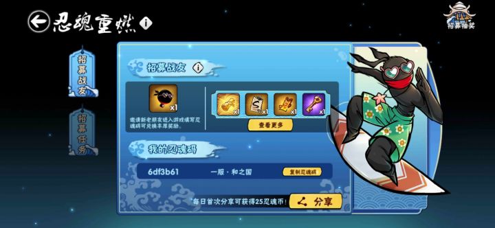 忍魂码 6df3b61 一区的新玩家和回归玩家一起来领奖吧,在主界面点击忍魂重燃 填写忍魂码 6df3b61 即可领取价值近千元的福利! 6df3b61 一起努力出金欧气满满!