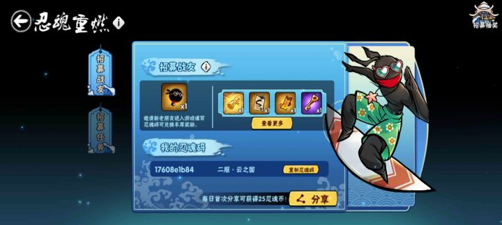 新人或回归玩家输入忍魂码1778a41598有大量s记悬赏,金钥匙,结神符还有返场限定皮肤可以领取,记住是二区喔