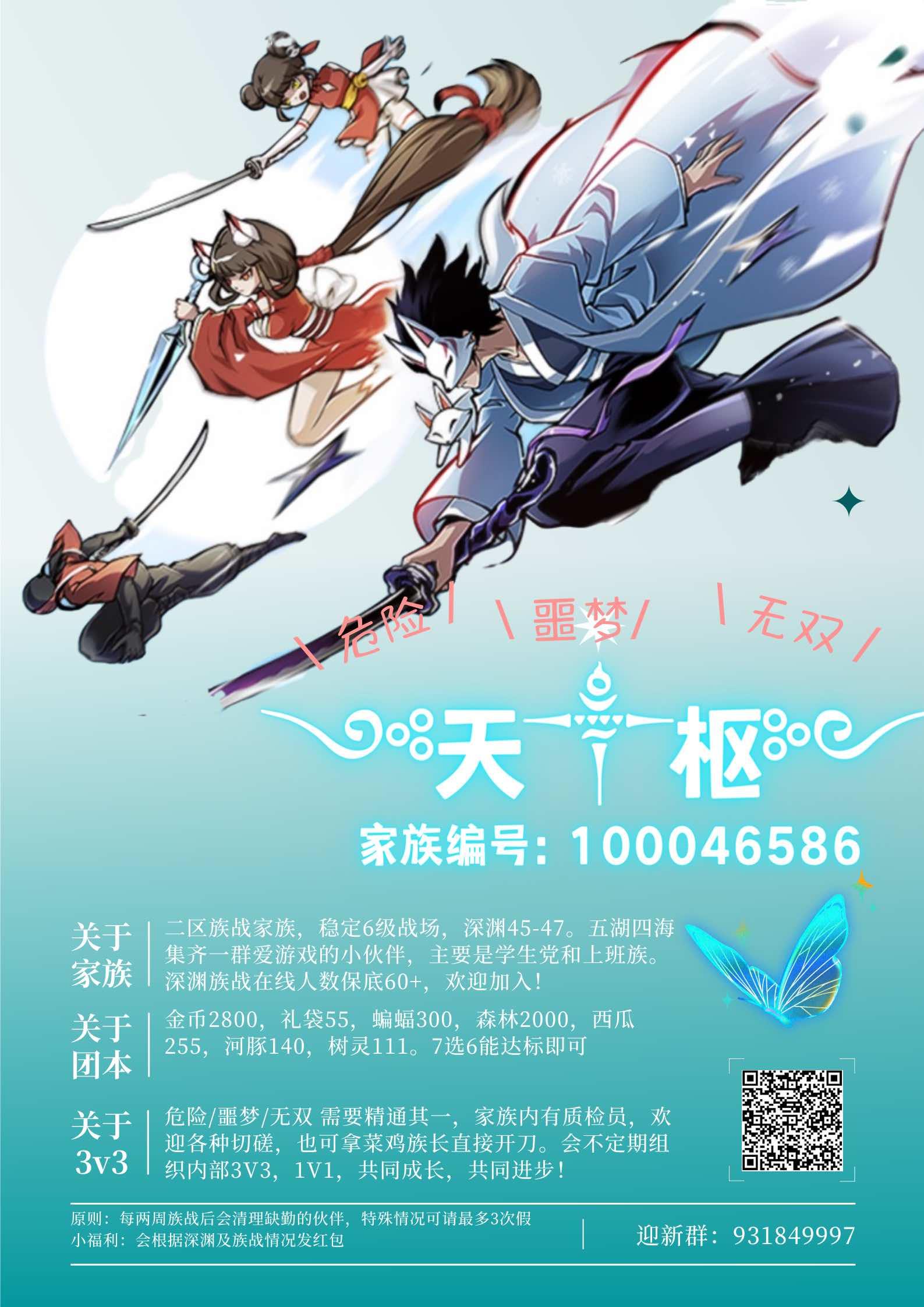 十级家族天枢新赛季招贤纳士,联赛六十四强,家族气氛超级好,有意私聊或加入Q群931849997咨询期待大佬的到来!