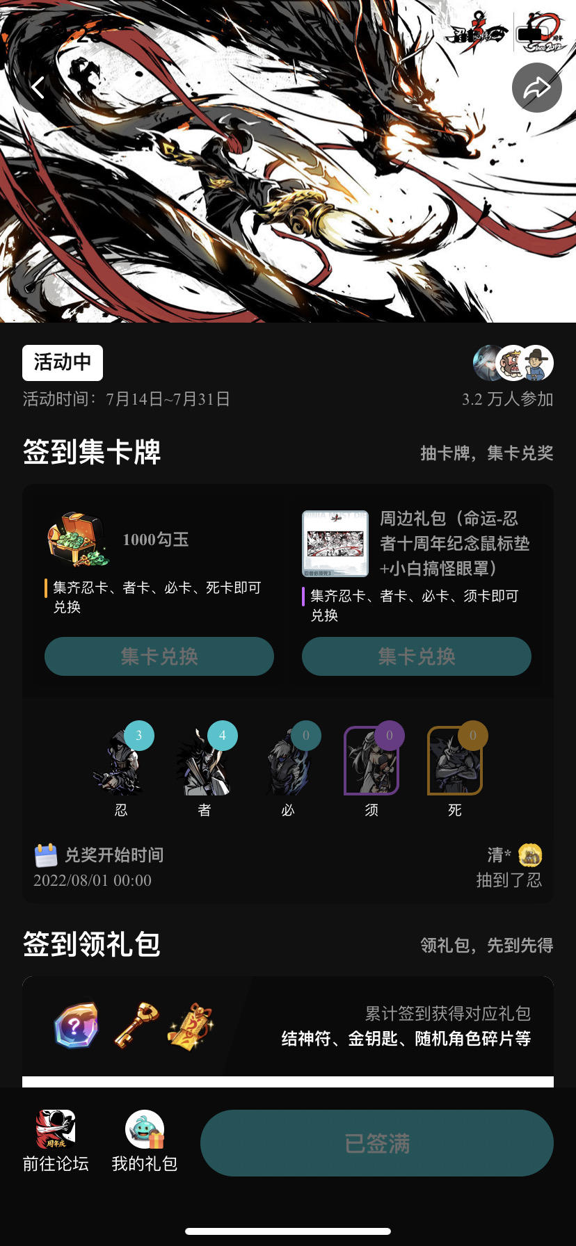 【签到福利】“忍者必须死3”周年庆版本签到福利来啦!https://www.taptap.com/events/game-sign/62ce647f?share_id=307f49164fb2&utm_medium=share&utm_source=copylink签到第七天,活动结束~我看看有哪些狗拖可以兑换勾玉和周边😒
