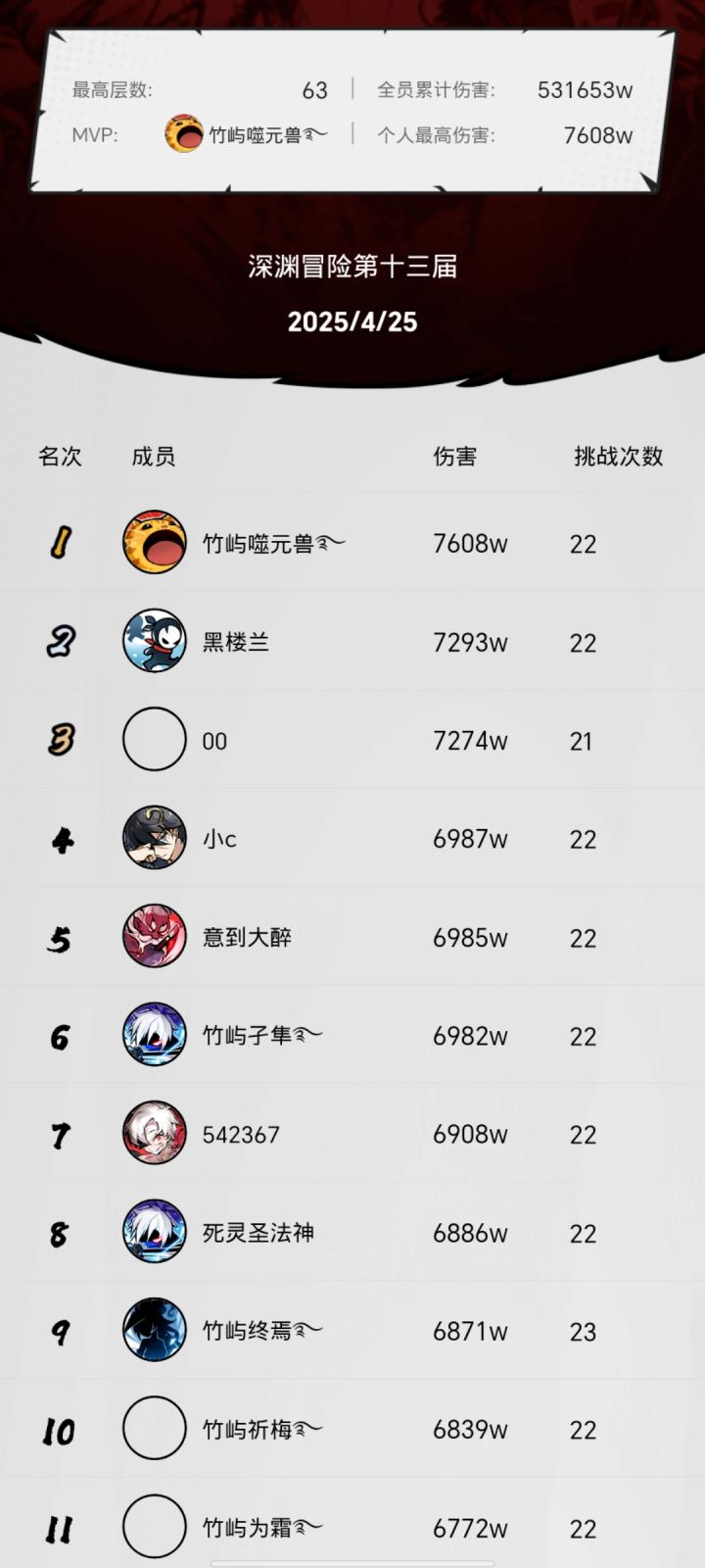 满员30人,独立群聊,氛围感拉满,无需进家族群和其他群,游戏的安排沟通福利,均在团体内部解决,团体内基本可打到周常 欢迎爱沟通,长期稳定,热爱深渊的输出大佬,来体验一下热闹有爱的小团体氛围。深渊和各种活动都有群语音(上周深渊群语音内13/26) 要求深渊稳定,统一名字,统一家族,深渊伤害3000W+ 目前所在家族彼岸往生堂,层数62-64层,本周90人过63层,4次深渊可以请假1次,其余勾玉