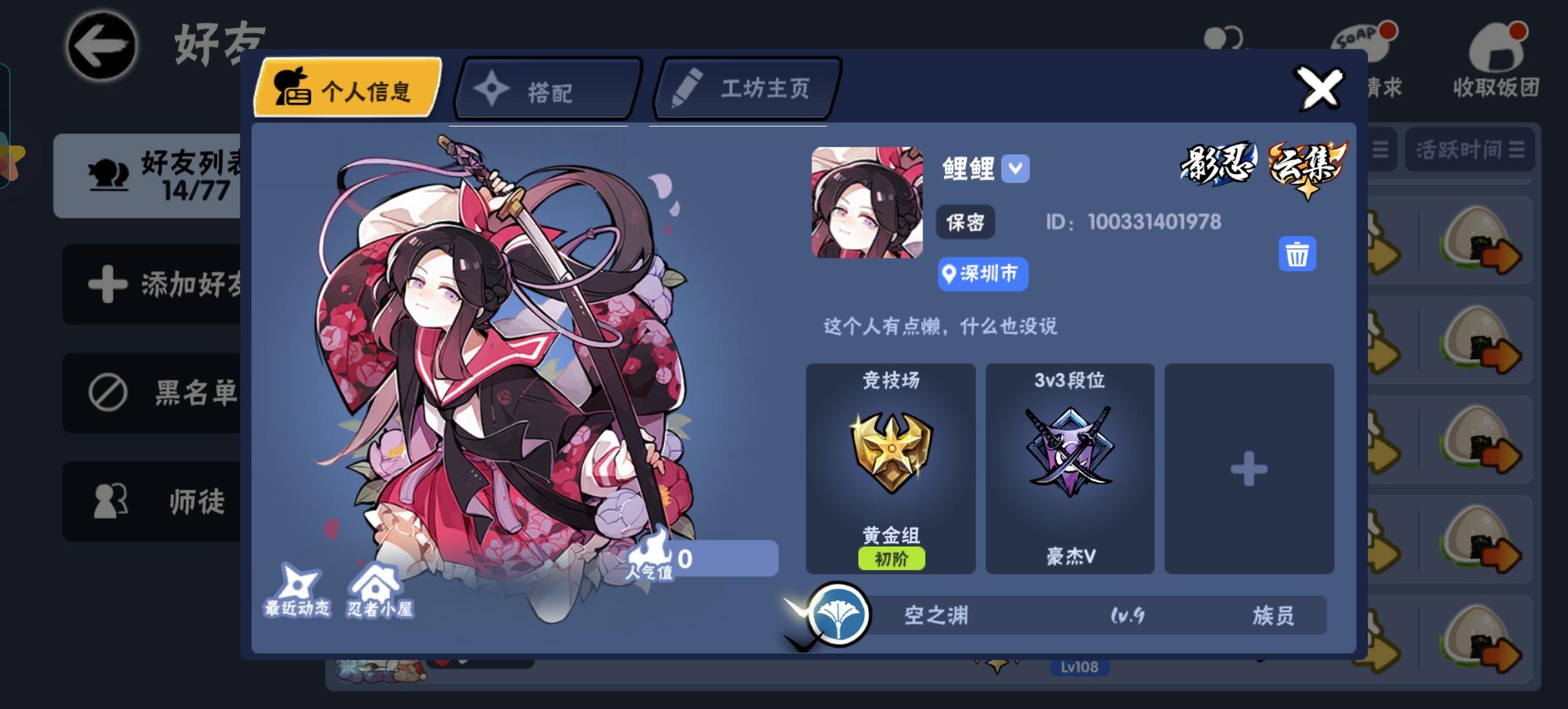 互SS说等朋友,等着等着就没声了,说的有模有样的,大家注意啊uid:100331401978家族:空之渊希望相关家族族长把这个人踢了重要事情说三遍(这是个人问题,这是个人问题,这是个人问题)