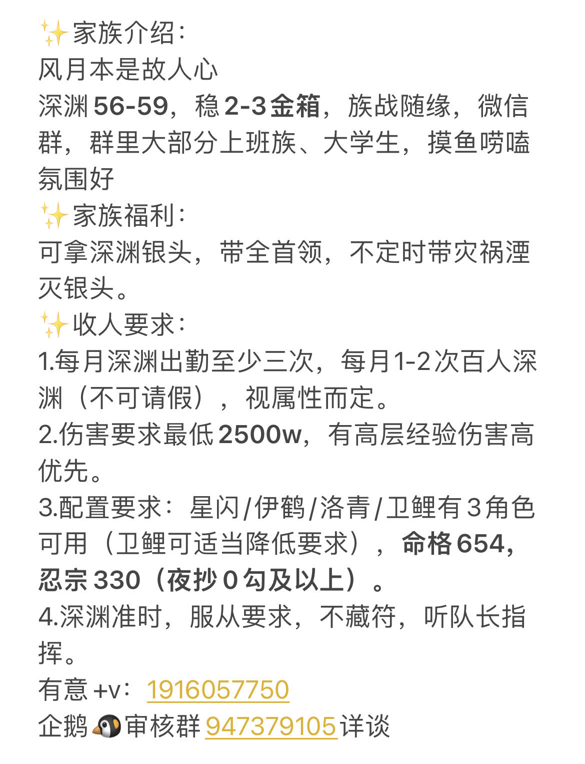层数56-59,佛系打深渊,属性好的时候百人,每月拉满三次即可。欢迎风月会所的新老朋友光临,企鹅接待群947379105