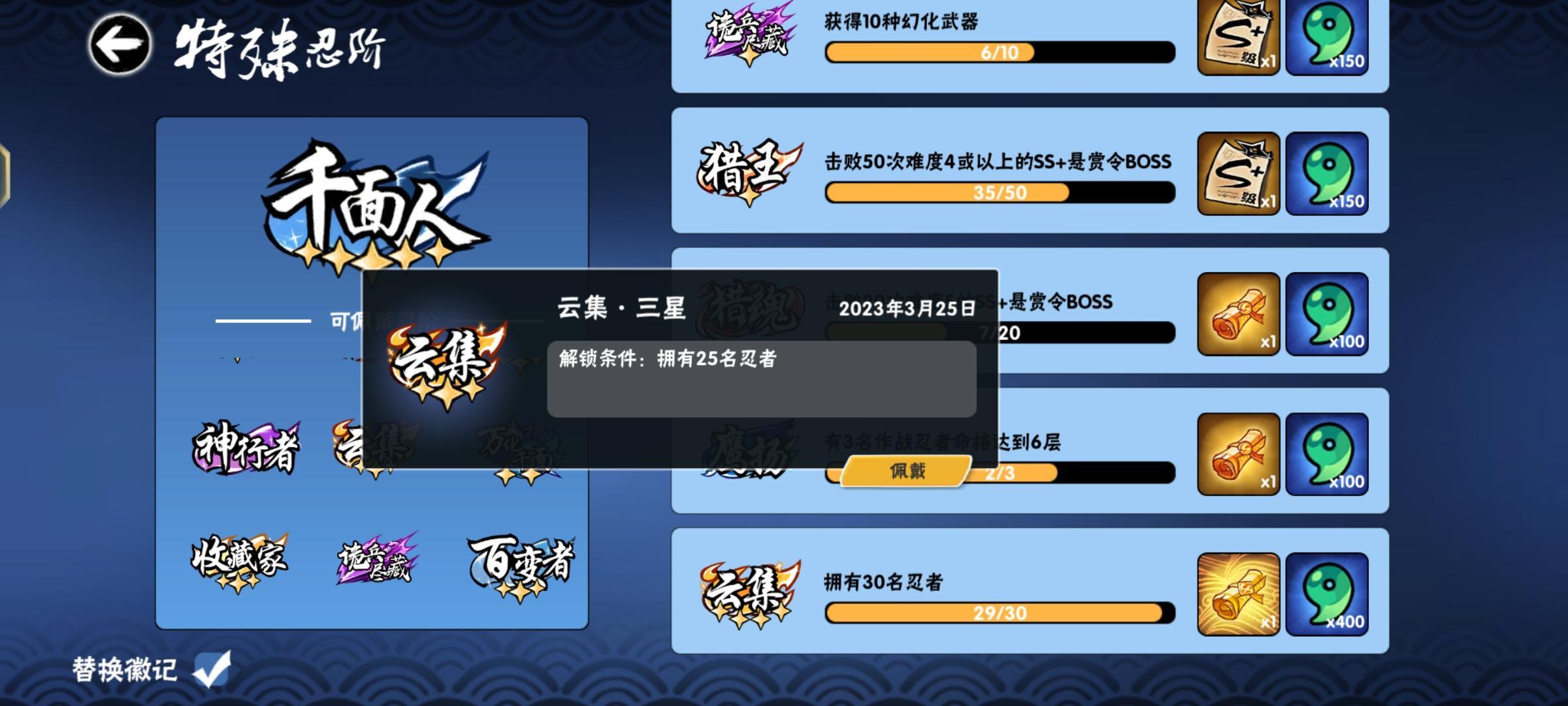 特殊忍阶云集的进度差一点就是不动,一直是29/30,上回忍痛灵识商店换了四个阿力的凑四命点上了还是不加进度,昨天抽卫鲤歪了银枭也不加进度,这玩意到底咋算的啊
