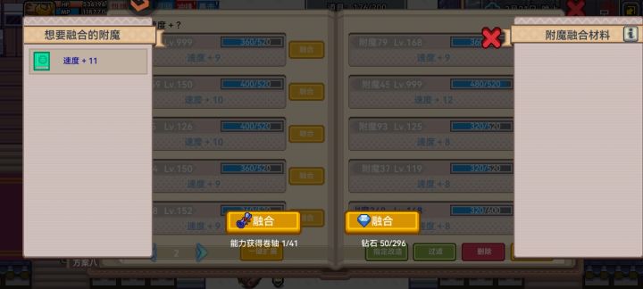 新出的筛选,结果是筛选品质,还和抽取放那么近,能不能放远点!这都不说了还有bug。图中+11速度的词条,是书里+8融合后了,然后书里还是显示+8。