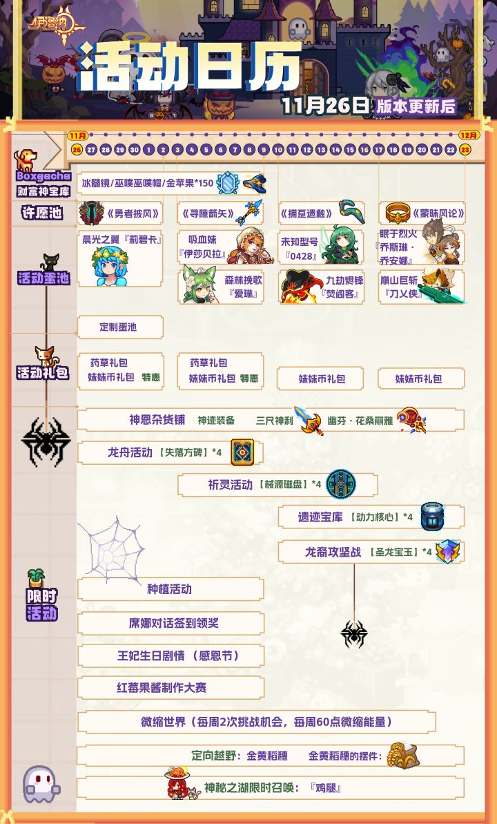 亲爱的冒险家:为保证伊尔瓦世界稳定运转,我们将于2025年11月26日09:00——2025年11月26日12:00进行停服维护,维护期间将无法登录游戏,请各位冒险家提前做好准备,以避免不必要的损失!【内容更新】王妃诞辰邂逅火鸡派对!诚邀冒险家共赴火鸡盛宴!1.版本活动日历冒险家们,火鸡节版本的冒险篇章即将开启!请收藏好日历,不要错过精彩环节哦~2.火鸡节系列活动a.王妃诞辰庆典x火