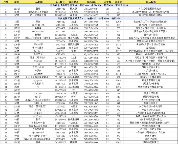 来啦来啦来啦!!!本次活动圆满落幕啦!一共收到了83份超有料的作品,真的是创意满满,让人眼前一亮呢一共64位幸运的冒险家成功瓜分了钻石*3000的大奖按照之前活动的承诺,这64位冒险家都会收到钻石*50的保底奖励还有前三名的冒险家们,你们可太厉害啦٩(ˊᗜˋ )و请在7个工作日内私信大小姐获取大小姐的联系方式,等待京东卡的发放哦其他冒险家们的游戏道具奖励已经在路上啦,最晚30个工作日内