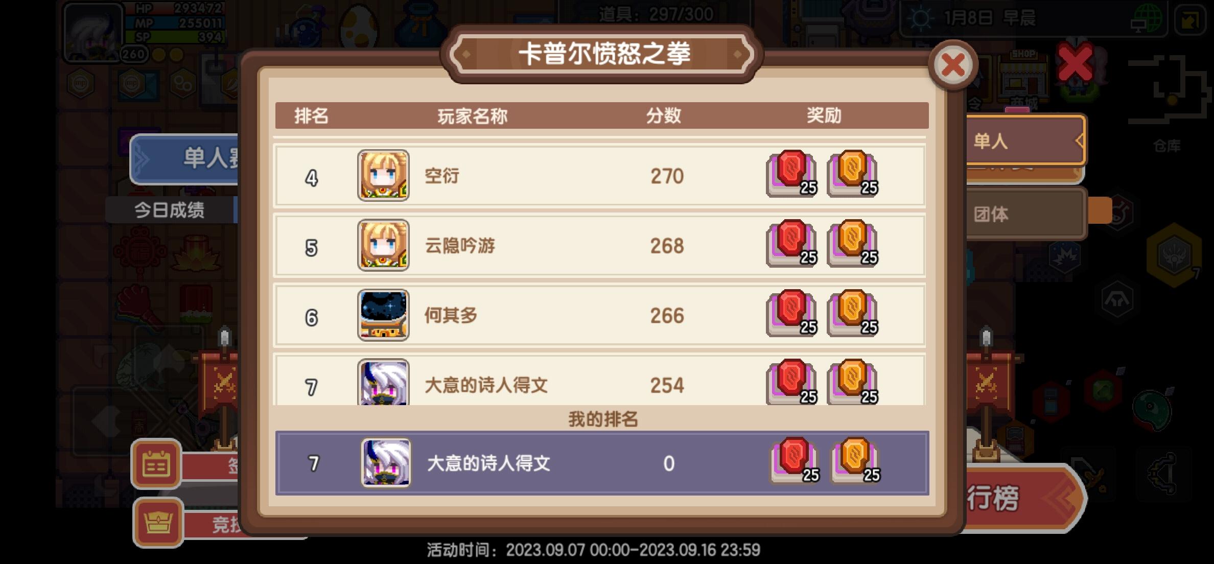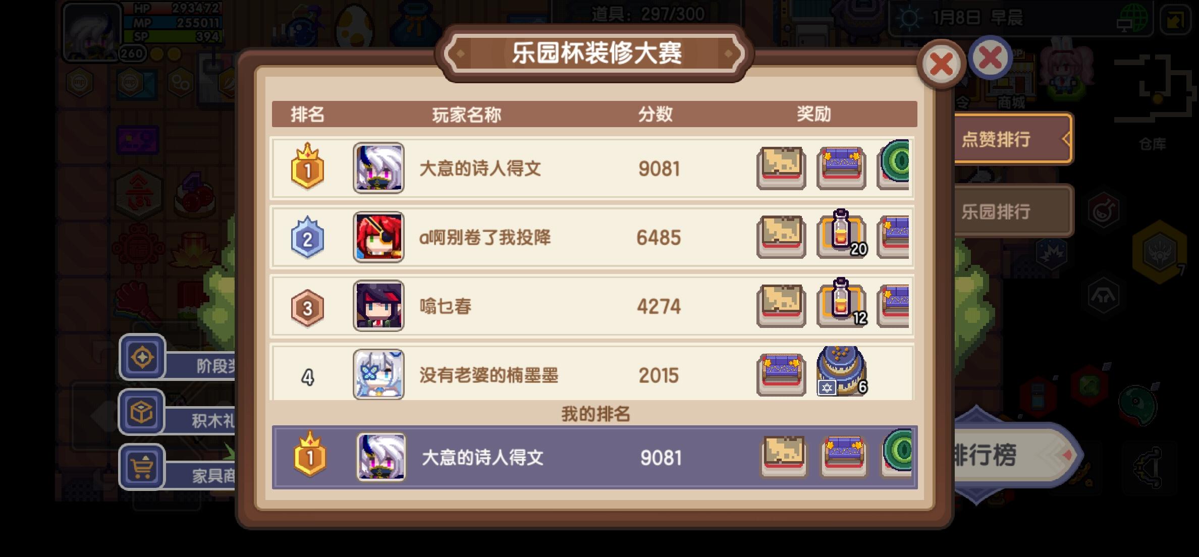 家具真的摆不动了,在好看和高分之间还是选择好看啦,该养个物理宠物了,幻沙单挑打不上去了,不过终于有内裤了-----------------并列第一还是挺合理的,竞速赛我睡着了,不然还能看看能不能抢个第三,下期宝库只能选秘宝了