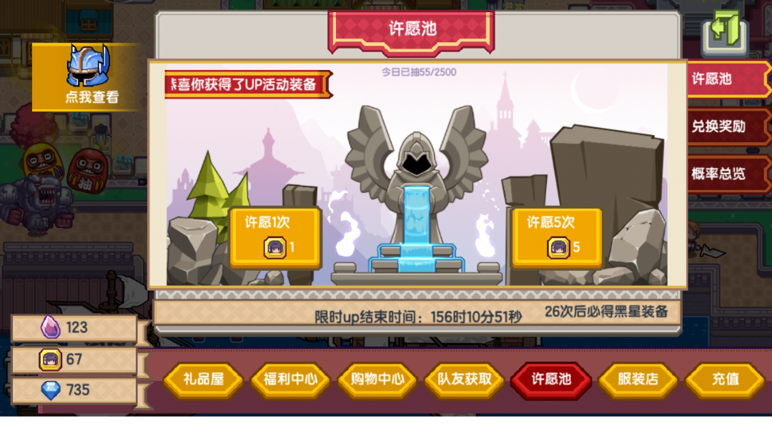 55抽结束战斗,等等看,小妖精总结:80抽 血源骑枪,海洋之心,泰尔,哨卫终于可以提升一波战力了,萌新最近就是刷刷,级别倒是升的快,没别的提升,幻沙仙女都没抽,没什么想养的宠物,只能继续囤资源,坐等贝壳,安妮复刻