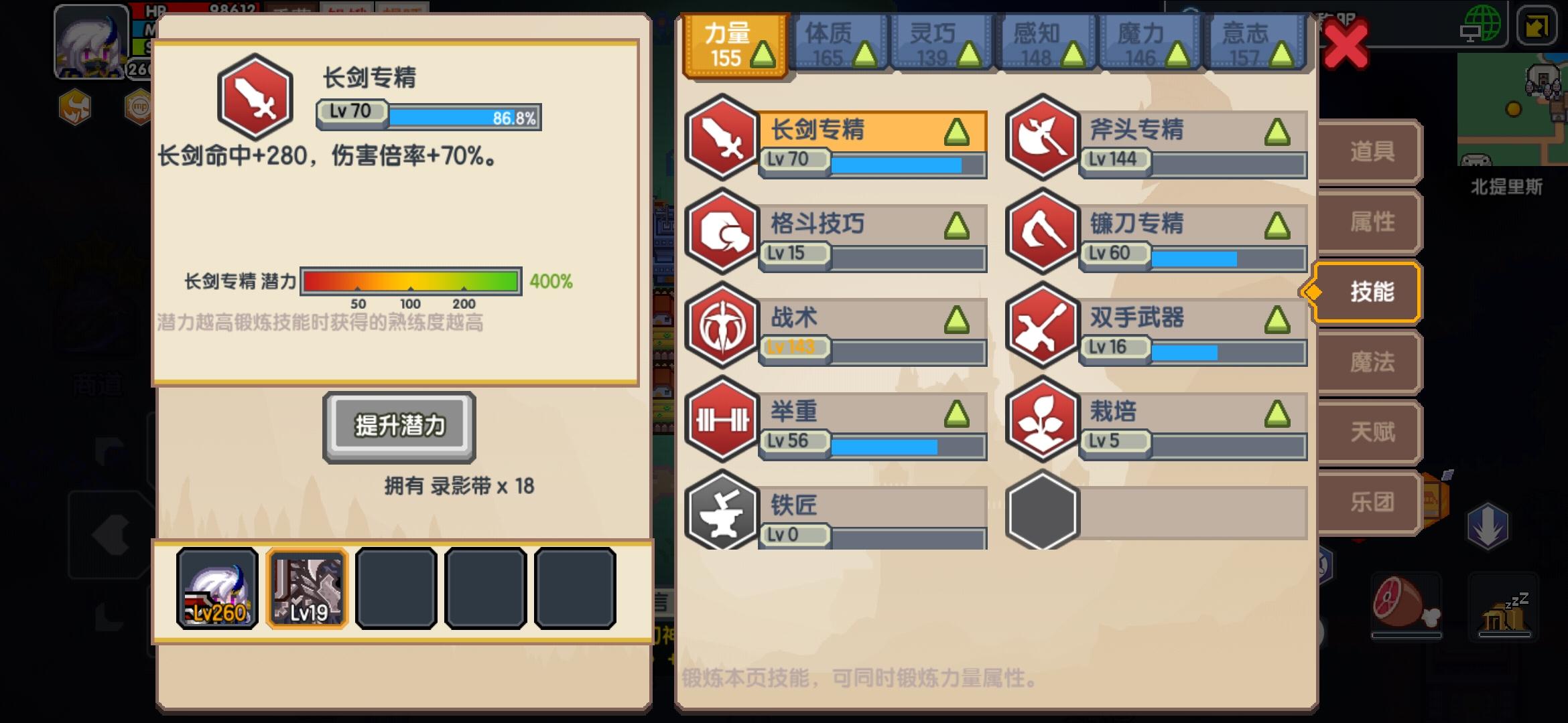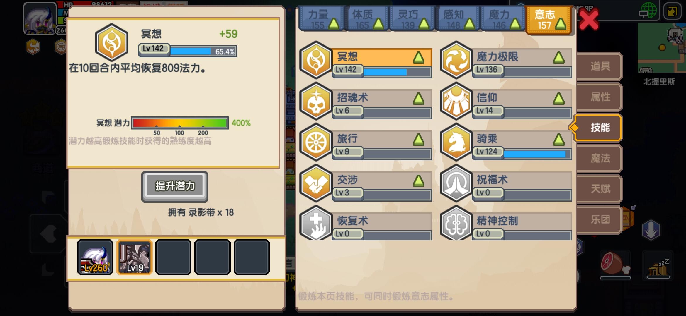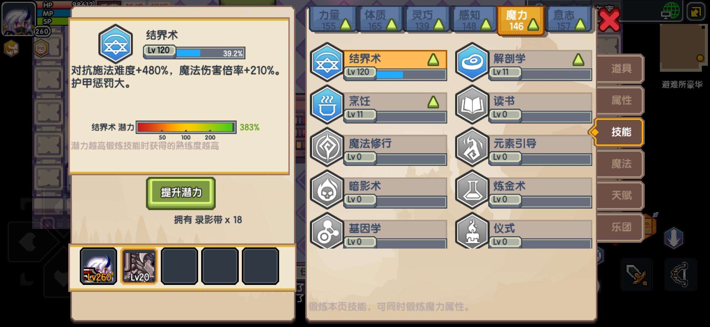 骑士养成日记500次练功房,结界术用挨打的方法练得还挺快的,终于两近战和法术都不涨经验了,今天训练结束