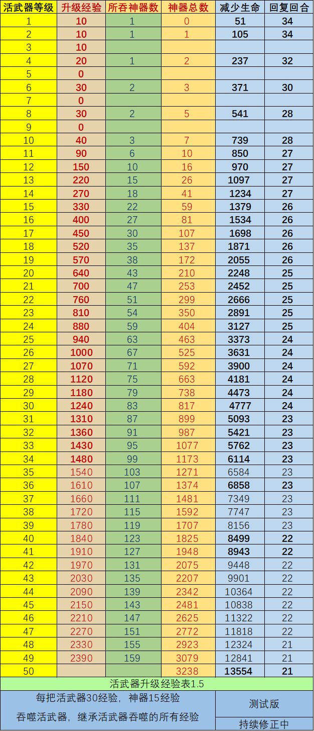 1. 这是粗略版的,由于活武器还只是初现雏形,没有投入过多精力。2. 活武器升级存在跳级现象,一些等级可能会跳过。这会是表格的主要误差来源。3. 活武器三维属性成长具有随机性。4. 更新后,吞噬神器可能额外提升约0.2属性该表格将持续更新。欢迎各位朋友的核对比较。