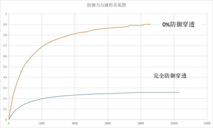 如图,防御力为0时,减伤为0%,攻击造成伤害为面板的100%随着防御力提升,减伤逐渐提升防御力低时曲线斜率大,防御力高时曲线斜率小当防御力提升到阈值后,减伤不再提升(防御阈值为8000左右)减伤上限取决于攻击方武器的防御穿透,防御穿透越高,减伤上限越低防御穿透与最大减伤关系如下完全穿透(无以太尾巴)等效150%穿透完全穿透(3层以太尾巴)等效250%穿透1、2层效果我也不知道注意