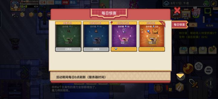 1.六维、耐性可观看我往期帖子2.每日(周)商店购买魔法店:快乐药水、麻痹药水、混乱药水、能力获得卷轴、不思议卷轴、长翅膀的卷轴、及各种相对不缺乏的物资(魔法店总共8个:)托马特(1)鲁米艾斯特(2)帕罗米亚(1)诺耶尔(1)韦尔尼斯(1)卡普尔港(1)罗斯利亚(1)万事屋:出售各种物资(小概率卖能力获得卷轴)魔法书作家代理:各种所需魔法书意向商店:每周稳定获取1个下四食物、20个光