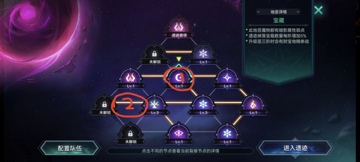 TAP上裂隙的攻略一大堆,但说实话,我看到的裂隙攻略,基本是写给已经明白裂隙是啥的朋友们,每个人的理解能力不一样,比如说我,就是很笨的那种,所以,大概帮助和我一样的小笨蛋们来理解一下裂隙!一、节点如图示中的1,就是叫做节点,每个节点都有机会升到3级,这取决于你在10次机会(就是进度条没满前每次刷到时间使徒的那个)中是否能再次选择到相同节点,节点会在在你的10次进度后固定(可以理解为,你有10次