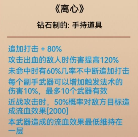 首先,这个手持道具感觉有点问题,和词条描述也不匹配,和图也不匹配,后续可能会有改动,这里先以测试服上线效果来解释。目前是手持道具,可以吃震荡核心加伤,而且是黑星可以打双宝珠,相当有用。追加打击80%,一条追打,有用。攻击出血的敌人时伤害提高120%,仅物理伤害生效,魔法伤害与追伤不生效。所以不要想着什么伤害翻倍了,不可能的(60%未命中不断追,由于当前版本该类词条溢出,所以只是有点用。当然