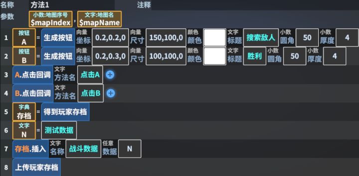 功能讲解:内购首先打开地图编辑器,从下方的“地图类”零件中拖出一个“分机逻辑方块”点击“加入房间”事件添加一个方法,添加如下测试用代码begincodeV1;name:方法1;1:UIButton A=fun ui.button(Vector3 0.2,0.2,0:Vector3 100,100,0:Color 255,255,255,255:String 血包:Float 50:Flo