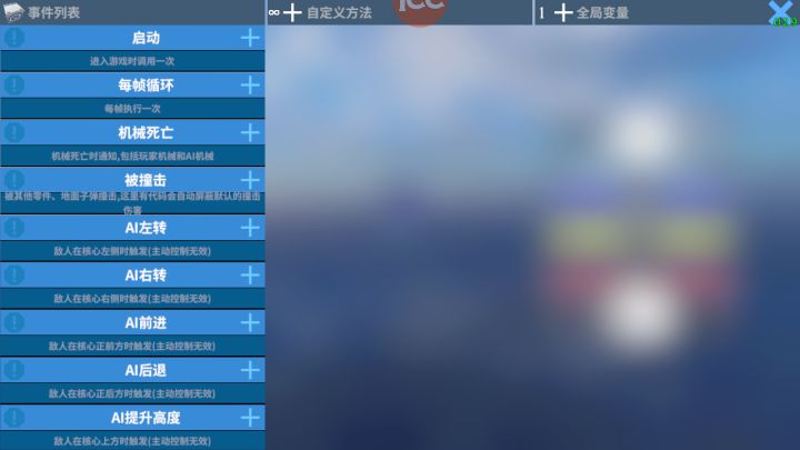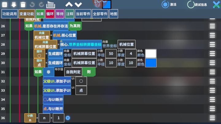 这是一个简单的教程打开游戏,进入机械创造模式,选装一个机械并开始制造它时,你会发现许多零件性质模板上有一个无穷的符号。这边是我们的逻辑功能。*我们可以用这个功能来分析问题,设计算法,编写程序,最后运行程序解决问题。(我们可以用不同的算法或者说流程图来解决问题。这里涉及到一些计算机知识,不多赘述。有感兴趣的可以找我私聊。)我们首先来看一下操作界面。我们可以找到一个每帧循环或者自定义方法,这