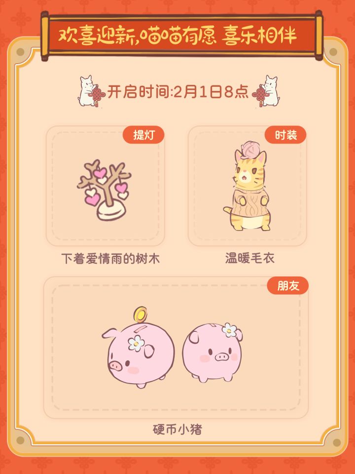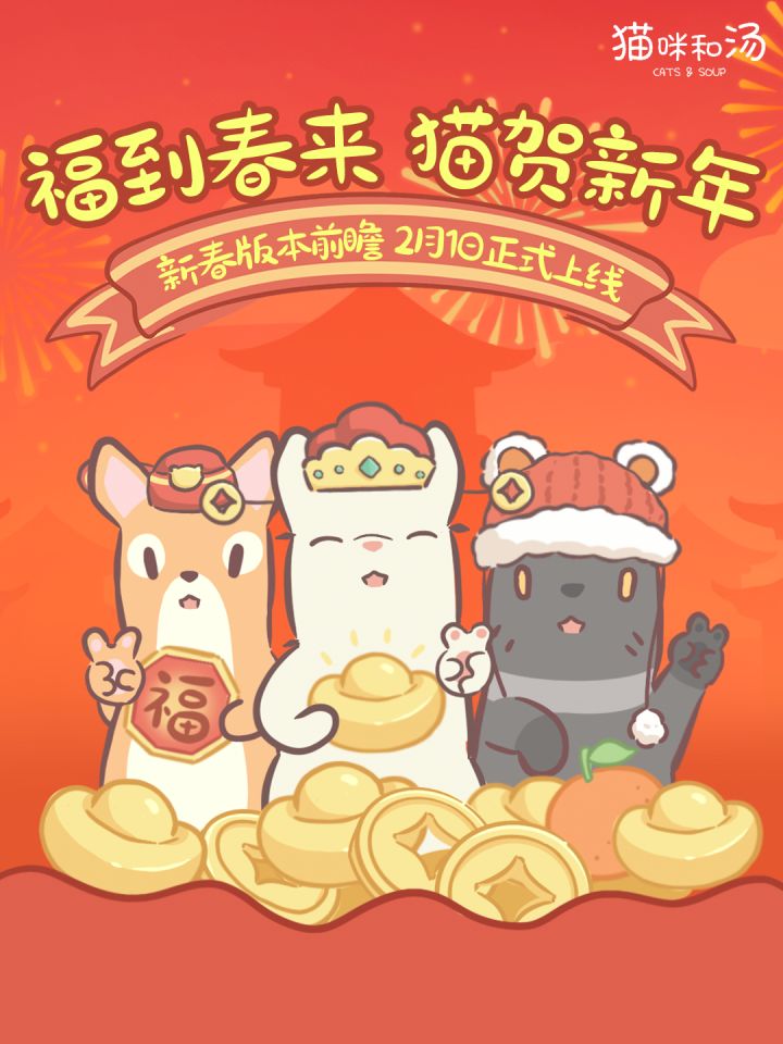 福到春来 喵贺新年新春到,猫猫们已经开始张灯结彩,一起迎接新春啦!◆ 新小屋上线!和猫猫们一起吃团年饭吧~◆ 猫咪森林来了新朋友!和可爱小猪温暖过冬~◆ 春节特别活动!猫咪森林有自己的集五福~◆ 新春限定礼包!采买年货好过节~#猫咪和汤 #游戏日常 #发现好游戏
