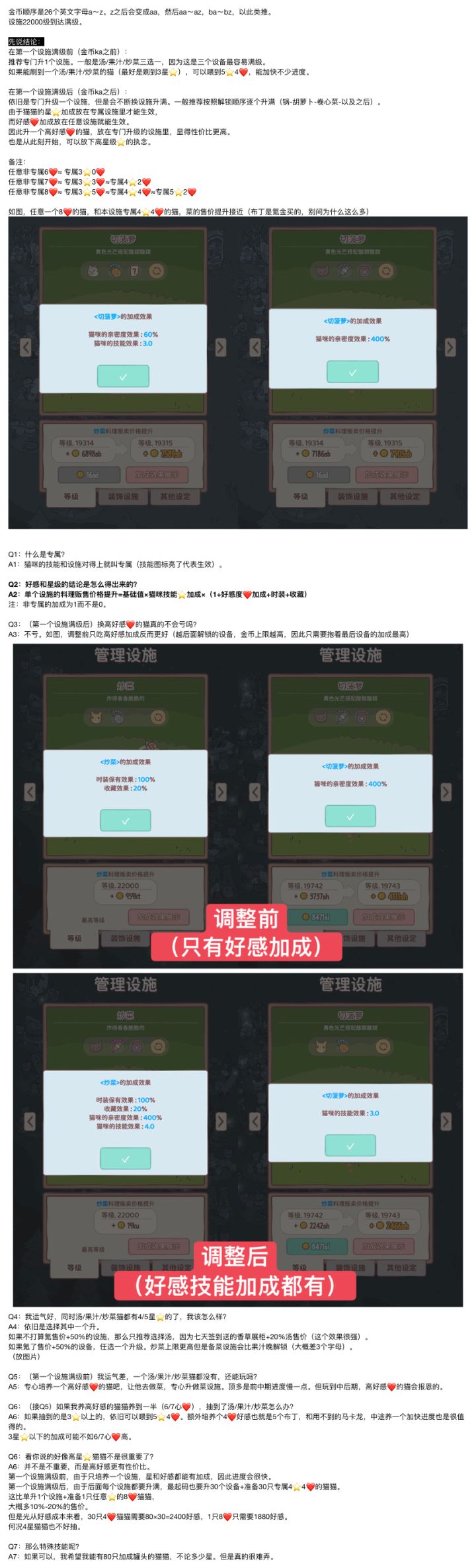 其实是回复评论区的,但tap把我评论吞了的样子?-----简单流程:从头到尾都是专门升一个设施就行。猫咪也是,只需要培养一个高好感❤️。-----猫咪的技能🌟只在第一个设施满级前有比较大的影响(理论上第一个设施可以任选)。满级后因为要不断换设施,好感❤️的影响更大。毕竟实在不太好凑不出30多个设施的高星、高好感猫猫泪目-----比如我现在,是双字母wd,炒菜猫5🌟