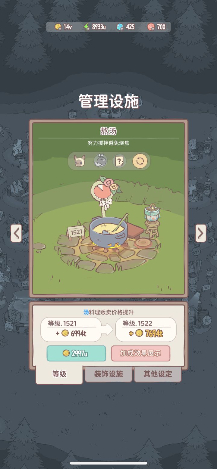 还可以控制屏幕调节左右声道 就是屏幕太亮了晚上看着不舒服 有考虑增设夜间模式或者夏夜主题吗 查看设施升级收益很不方便 只能点开挨个查找 烦 不能一目了然的知道现在的进度 不清楚平均升级升的是炒菜果汁还是汤 也不知道原来几级升级完菜品加了多少钱 我也没搞懂升级顺序的逻辑凭什么先升这个后升那个 哪些多少级现在多少钱没办法一眼望过去 还要挨个找同时脑子里对比有没有谁拖后腿了 一开始没多少锅真的很较真