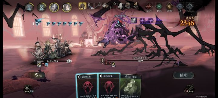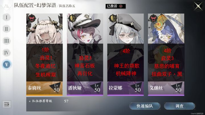 众所周知,血肉的角色里,没有一个跟反击沾边的(不知道明天的新角色会不会是带反击的血肉角色),但是我还是要来分享这套血肉反击队,玩起来还是有点意思的。队伍搭配如下(图中红字是养成度的要求及命轮和密契):这个队伍的基本思路是:1.启动前确保手中有胚胎、古老的爱抚(或者拉蒙娜的大招)、泰旖丝的大招2.开启泰旖丝大招触发吞噬,获得两张圣洁之子,同时触发钟楼内的过往,获得小小愿望3.用古老的爱抚给