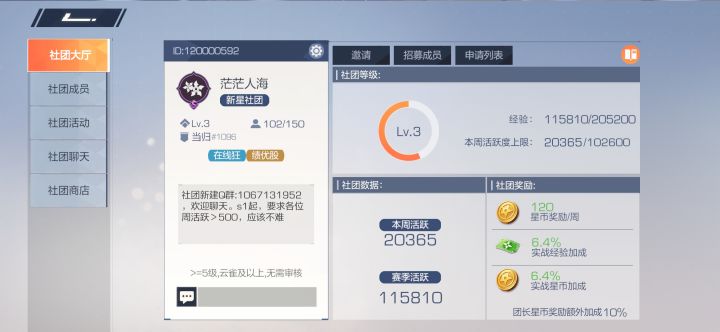 s级高活跃社团“茫茫人海”每晚会有腾云车队冲星穹(今晚就有两个星穹了)佛系招人,要求周活跃度>500即可社团聊天吹逼群:1067131952(刚建成)群内有正在不断更新的个人总结的适合萌新观看的攻略: